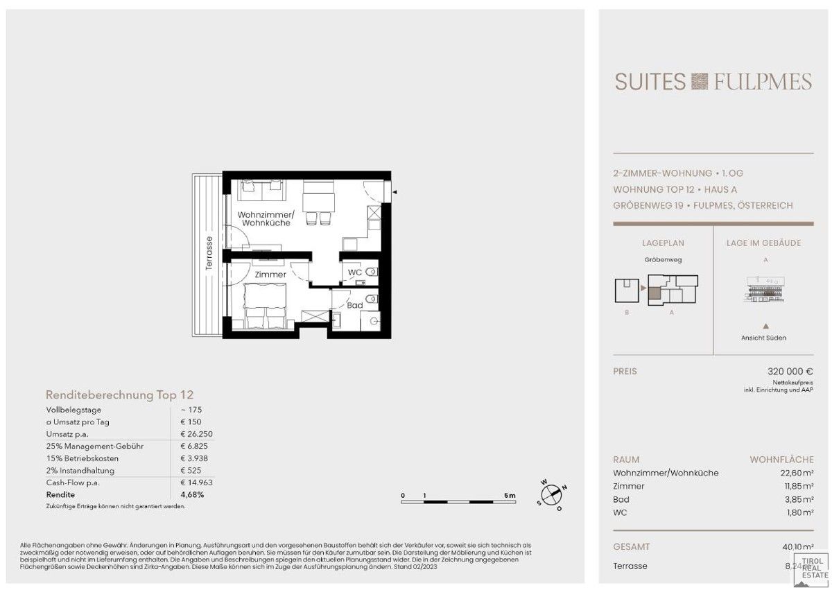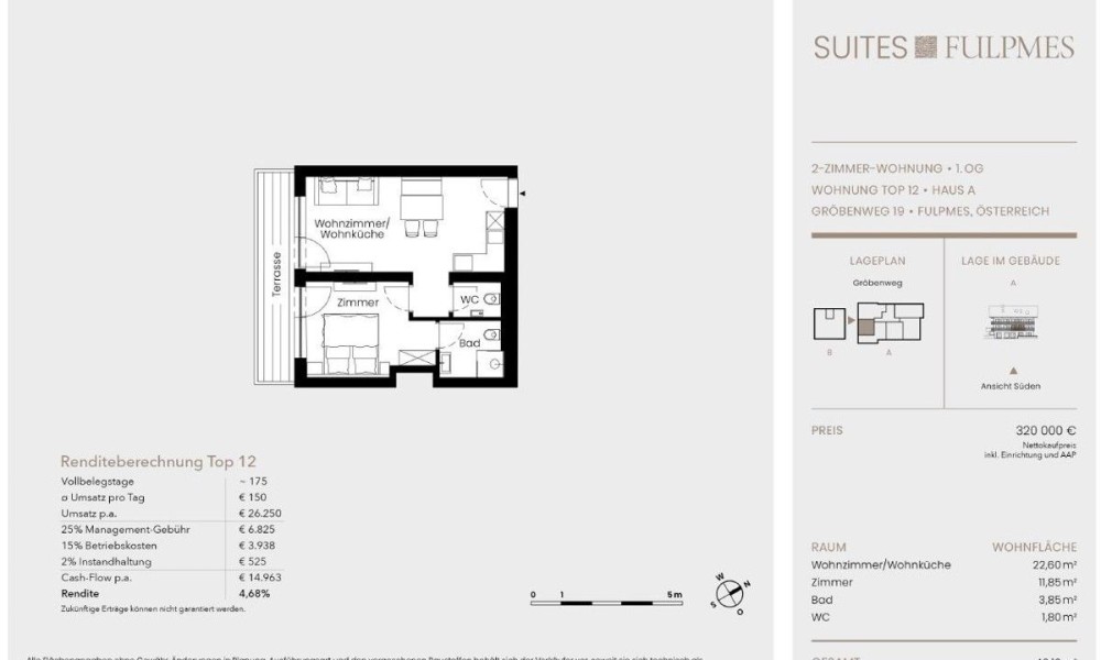 A fitness room I ‘Stubai Mountain Gym’ and an exclusive fireplace lodge I ‘Stubai Mountain Fireplace Lodge’ complete the extraordinary offer.The property offered is a tourist investment, which is rented out to changing guests by the renowned operating company ALPS RESORTS (market leader in the DACH region of the Alps).Net purchase price €265,000.00