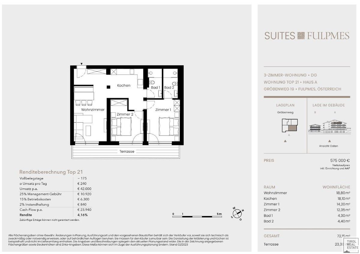 A fitness room I ‘Stubai Mountain Gym’ and an exclusive fireplace lodge I ‘Stubai Mountain Fireplace Lodge’ complete the extraordinary offer.The property offered is a tourist investment, which is rented out to changing guests by the renowned operating company ALPS RESORTS (market leader in the DACH region of the Alps).Net purchase price €510,000.00