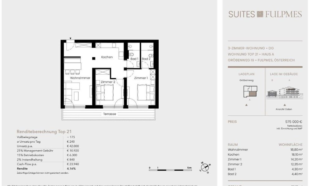 A fitness room I ‘Stubai Mountain Gym’ and an exclusive fireplace lodge I ‘Stubai Mountain Fireplace Lodge’ complete the extraordinary offer.The property offered is a tourist investment, which is rented out to changing guests by the renowned operating company ALPS RESORTS (market leader in the DACH region of the Alps).Net purchase price €344,000.00