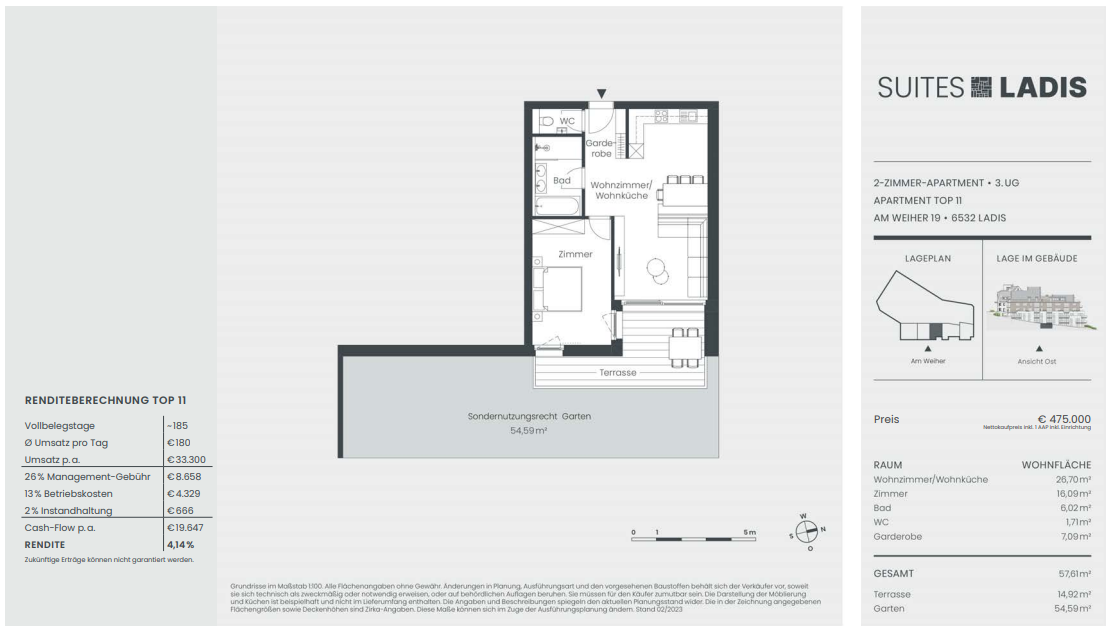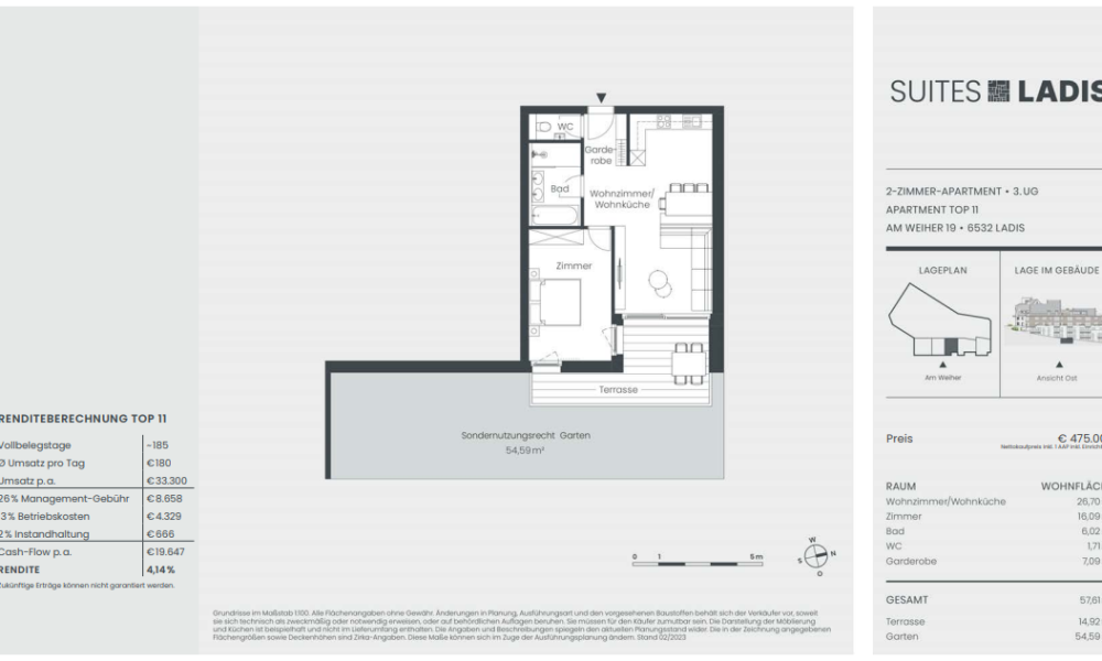 The SUITES LADIS on the Serfaus-Fiss-Ladis sun terrace combine the highest standards of quality and comfort with Tyrol’s unique nature and close ties to its homeland to create a capital investment with impressive prospects of success.A total of 41 exclusive SUITES, spread over 5 floors, are for sale. The SUITES LADIS, which are handed over ready to move into, are fully furnished and impress with their exclusive design and outstanding quality down to the smallest detail.In this case, we present the elegant 2-room suite with a living space of 57,61m² and a fantastic 14,92 m² balcony. The highlight of this apartment is a private garden of 54,59 m2.Do not hesitate to contact us, we will be happy to answer your questions at any time!The property on offer is a tourist investment which is rented out to changing guests via a renowned operating company. Net purchase price € 445,000.00