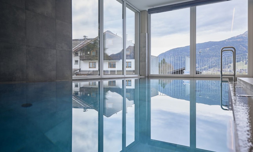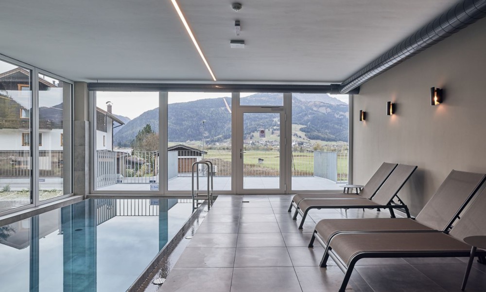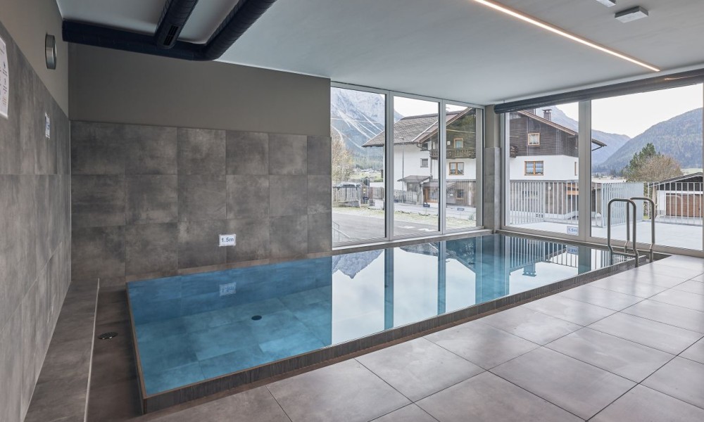 The perfectly laid out flat has 55 m² of living space, which is divided as follows: entrance hall, bedroom, bathroom and a living/cooking/dining area. From the living area you have access to the marvellous sun terrace On the ground floor of the house there is a wellness area with an indoor infinity pool, a Finnish sauna, bio-sauna and infrared cabin, regeneration shower and a relaxation room for complete relaxation.A photovoltaic system and an air heat pump are installed at the Zugspitz Residence for an all-round sense of well-being. This technology can make a significant contribution to climate protection and is also inexpensive to maintain. This self-generated electricity can not only be used to power household appliances, but also, in combination with the heat pump, to heat the building or charge an electric car.
