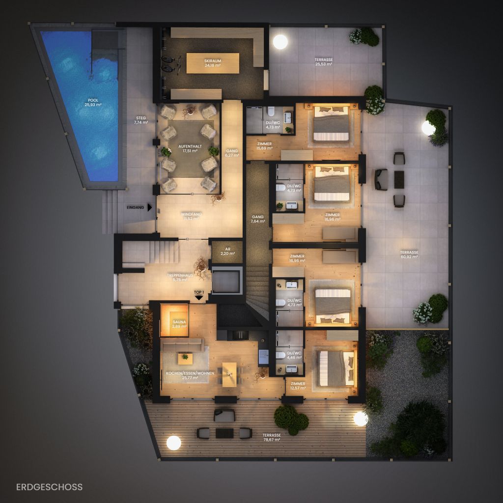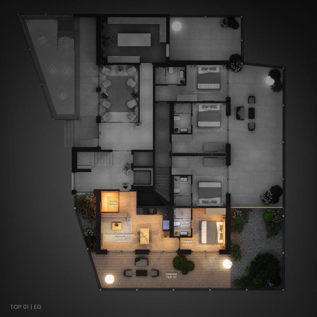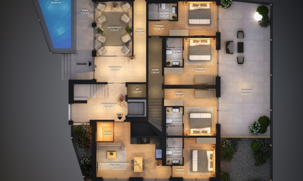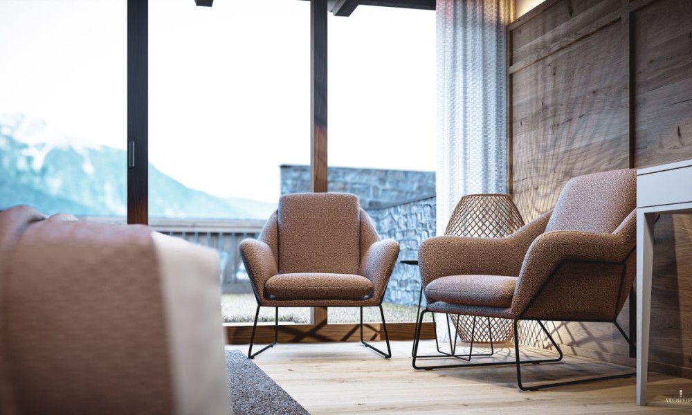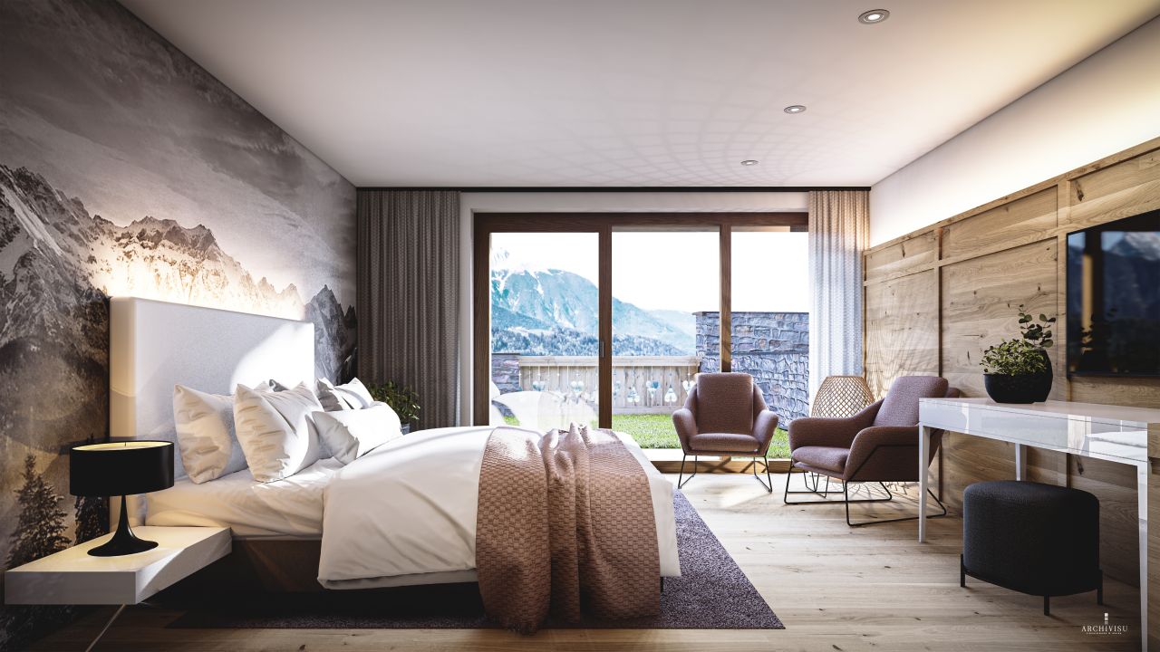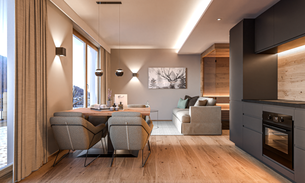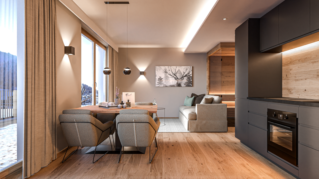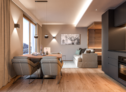 Experience the ultimate in luxury and comfort at the LENI Mountain Lodges. Four exclusive apartments are being built in Sölden, offering a unique ski-in/ski-out experience. Nestled in the breathtaking mountain scenery of the Ötztal, the luxury lodges are the ideal year-round retreat for unforgettable adventures and relaxing moments in the heart of nature.The apartments, which range in size from 65 m² to 137 m², impress with their spacious terraces and fantastic views of the surrounding mountain landscape. All apartments have their own private sauna. But that’s not where relaxation ends after a day of sports, because there is also an outdoor swimming pool in the wellness area.Cosy Lodge – TOP 01The Cosy Lodge is located on the ground floor of the LENI Mountain Lodges. Cosiness meets first-class design in an area of 65 m².