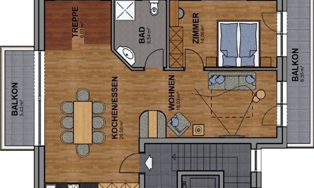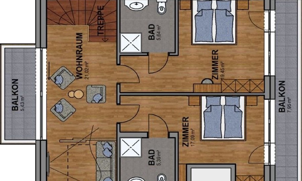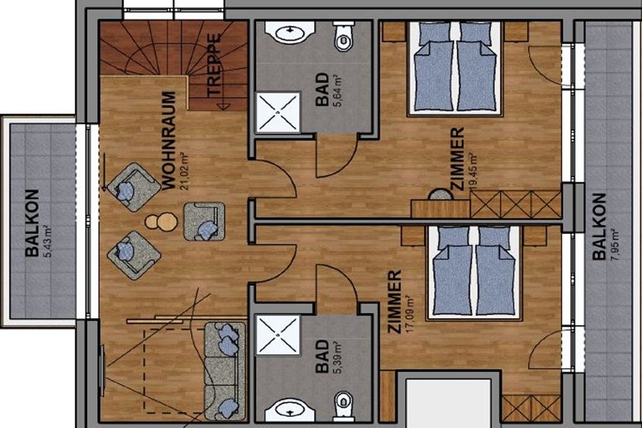 The modern bathroom is equipped with a spacious shower, toilet and stylish elements. Two balconies, with an area of 5.43 m² and 6.55 m², extend the living space outdoors and offer magnificent views – ideal for starting the day with a coffee or letting the evening come to a relaxed close.The upper floor is equally well designed and has two generously sized bedrooms. Both rooms open out onto another balcony, which, at 7.95 m², provides additional space. Two modern bathrooms offer comfort and privacy for everyone. The additional living space on the upper floor offers a range of possibilities, whether as a further living area or a retreat.The property on offer is a tourist investment that is rented out to a variety of guests through a well-known operating company. You will benefit from lucrative returns and excellent prospects.Purchase price incl. furnishings and AAP net €1,490,000.00Purchase acquisition costs: