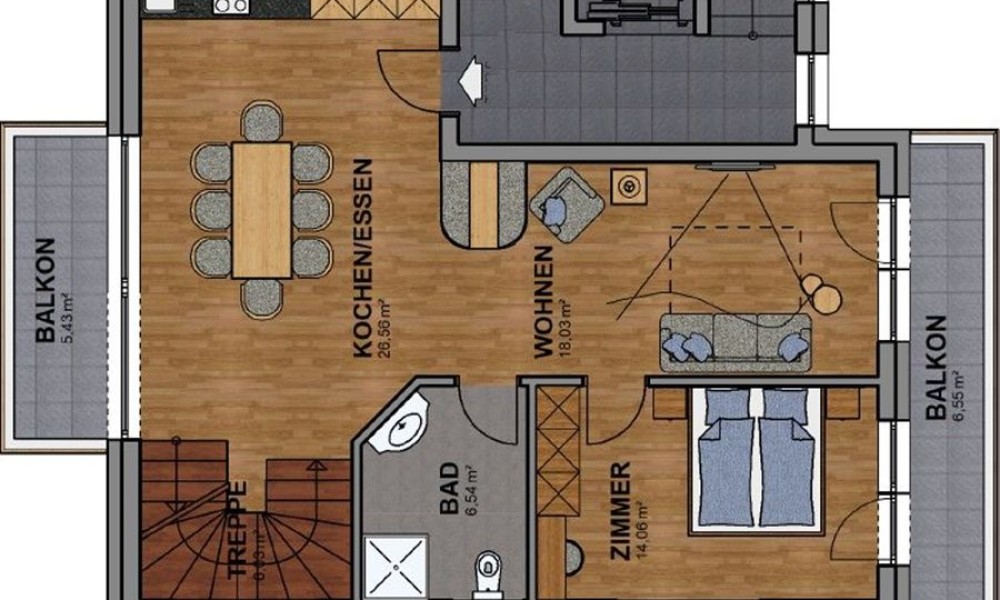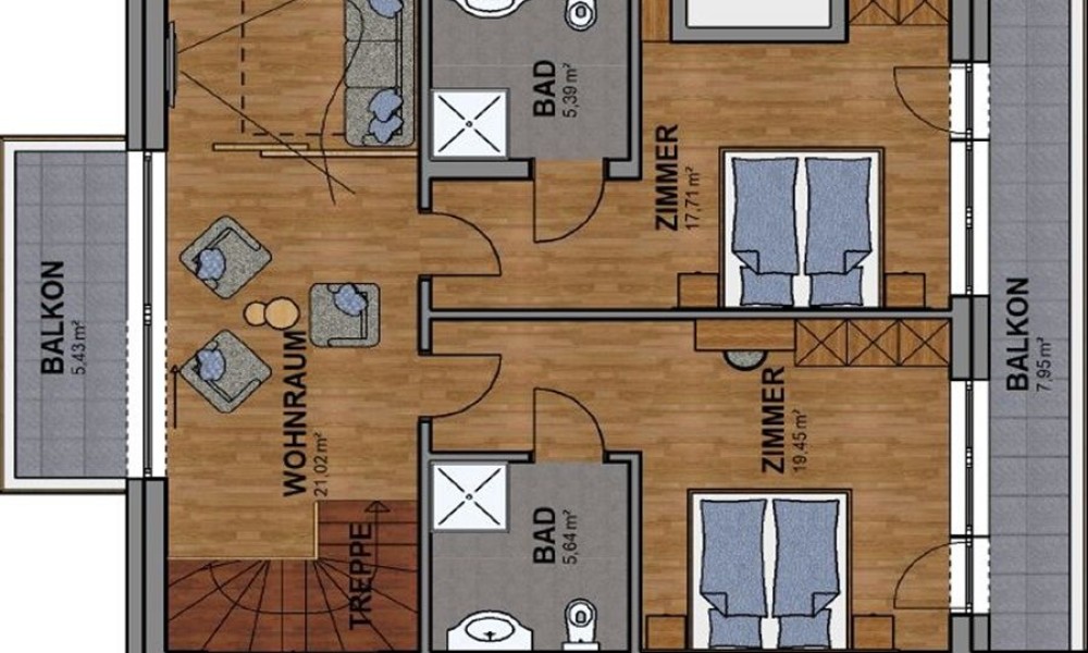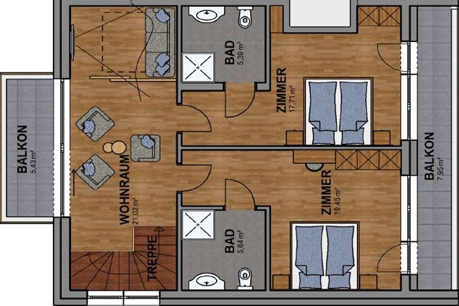 The modern bathroom is equipped with a spacious shower, toilet and stylish elements. Two balconies, with an area of 5.43 m² and 6.55 m², extend the living space outdoors and offer magnificent views – ideal for starting the day with a coffee or letting the evening come to a relaxed close.The upper floor is equally well designed and has two generously sized bedrooms. Both rooms open out onto another balcony, which, at 7.95 m², provides additional space. Two modern bathrooms offer comfort and privacy for everyone. The additional living space on the upper floor offers a range of possibilities, whether as a further living area or a retreat.The property on offer is a tourist investment that is rented out to a variety of guests through a well-known operating company. You will benefit from lucrative returns and excellent prospects.Purchase price incl. furnishings and AAP net €1,450,000.00Purchase acquisition costs: