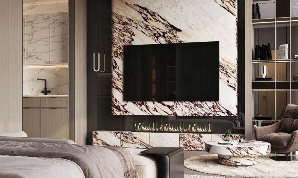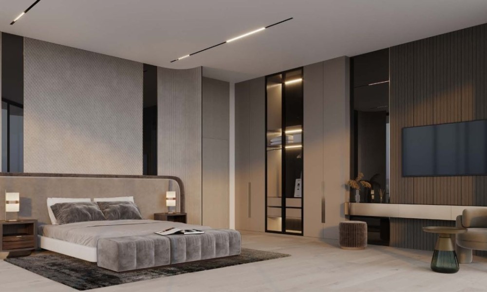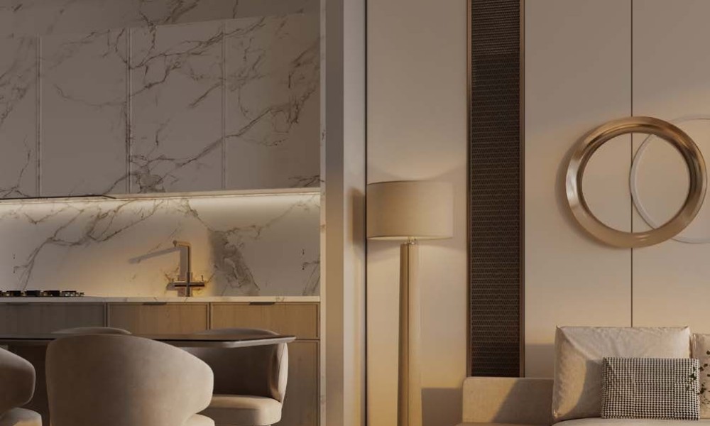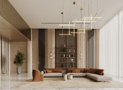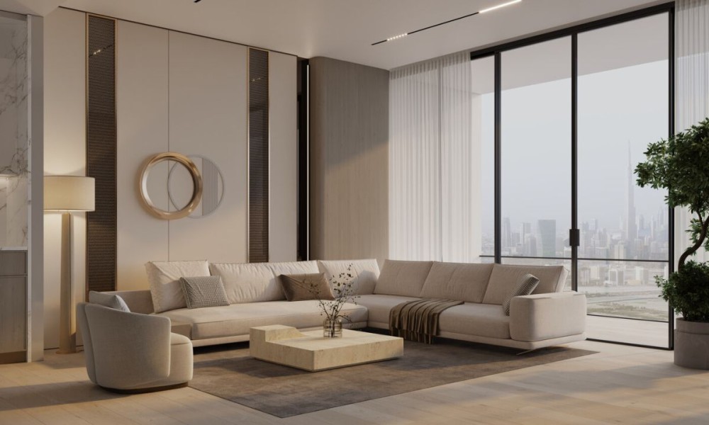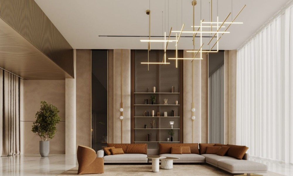 Modern design with crystalline glass façades. Luxurious interior finishes with premium materials, including brushed brass accents, marble surfaces, and custom-designed fittings.