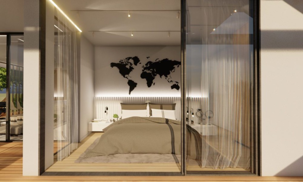 Modern and elegant 2-bedroom apartment with a total covered area of 126 square meters. Features a 21 square meter covered veranda, promoting outdoor living and relaxation. Architectural design emphasizes open-plan living, facilitated by expansive glass features. includes two bathrooms, one of which is en-suite, ensuring convenience and privacy for residents.