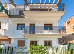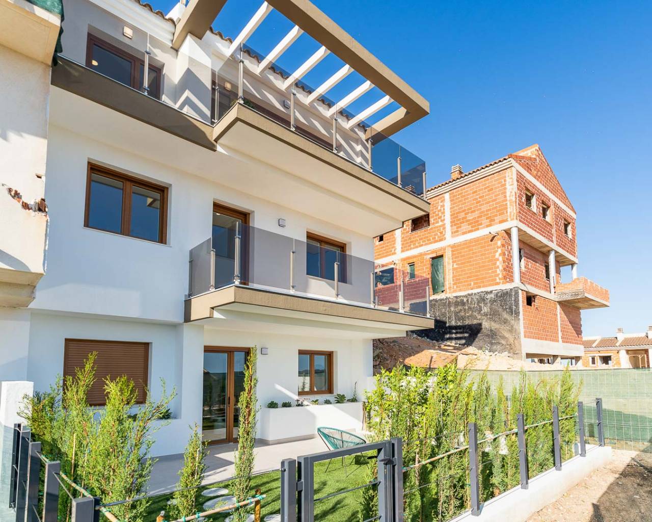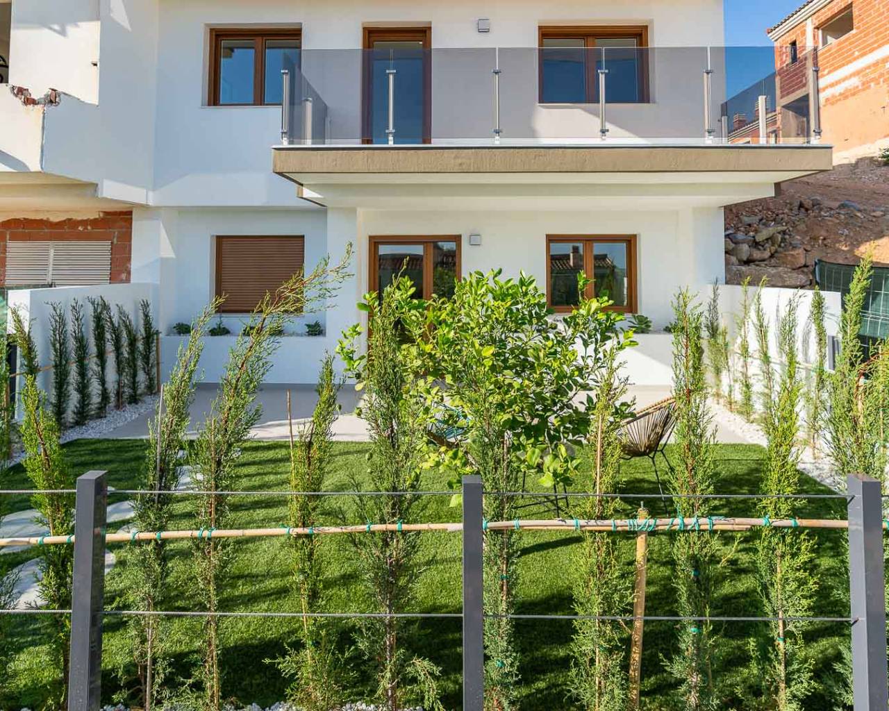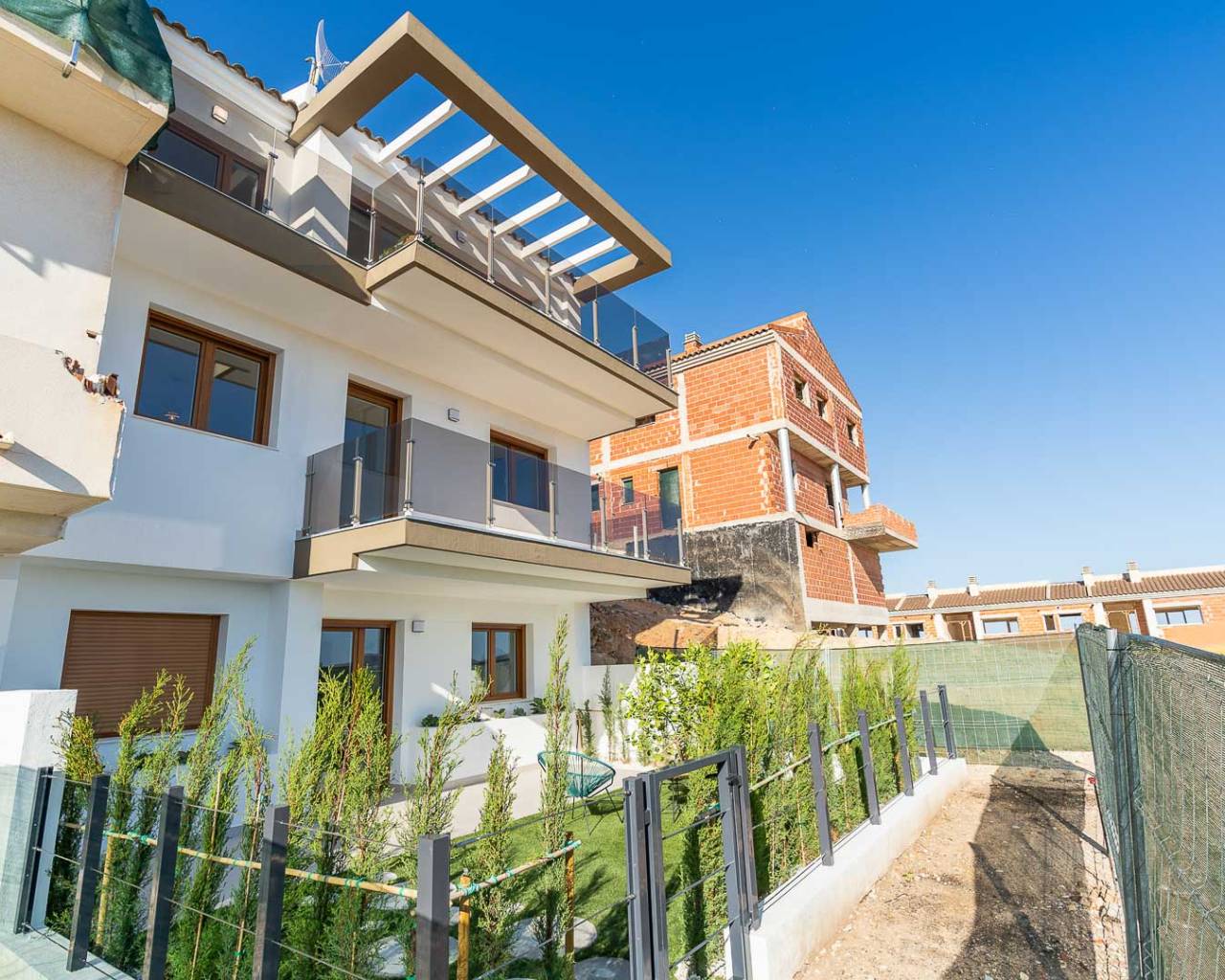 The spacious layouts have been designed to promote a relaxed lifestyle, in contact with nature, with large windows that flood the spaces with light and encourage the connection between indoors and outdoors. Each home has multiple terraces from which you can enjoy spectacular views, a private garden with direct access to the communal areas and parking for two vehicles. Some of them also have a solarium, perfect for enjoying evenings outdoors in the company of family and friends. Distributed over three levels, the upper floor houses the main entrance with two parking spaces, a spacious entrance hall with cloakroom, a guest toilet, an elegant living area with large sliding windows, a modern open-plan kitchen with pantry and a terrace that invites you to relax and contemplate. On the first floor, comfort is elevated with a double bedroom with en suite bathroom and a spectacular master bedroom with en suite bathroom, both with access to a private terrace. Finally, on the ground floor, the space adapts to the needs of each owner, allowing for various configurations, such as an additional living area, an office or even two more bedrooms with en-suite bathrooms, all connected to the garden. This residential complex represents a perfect fusion between design, quality of life and a privileged natural environment, where every detail has been carefully thought out to offer an exceptional living experience.