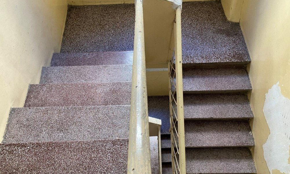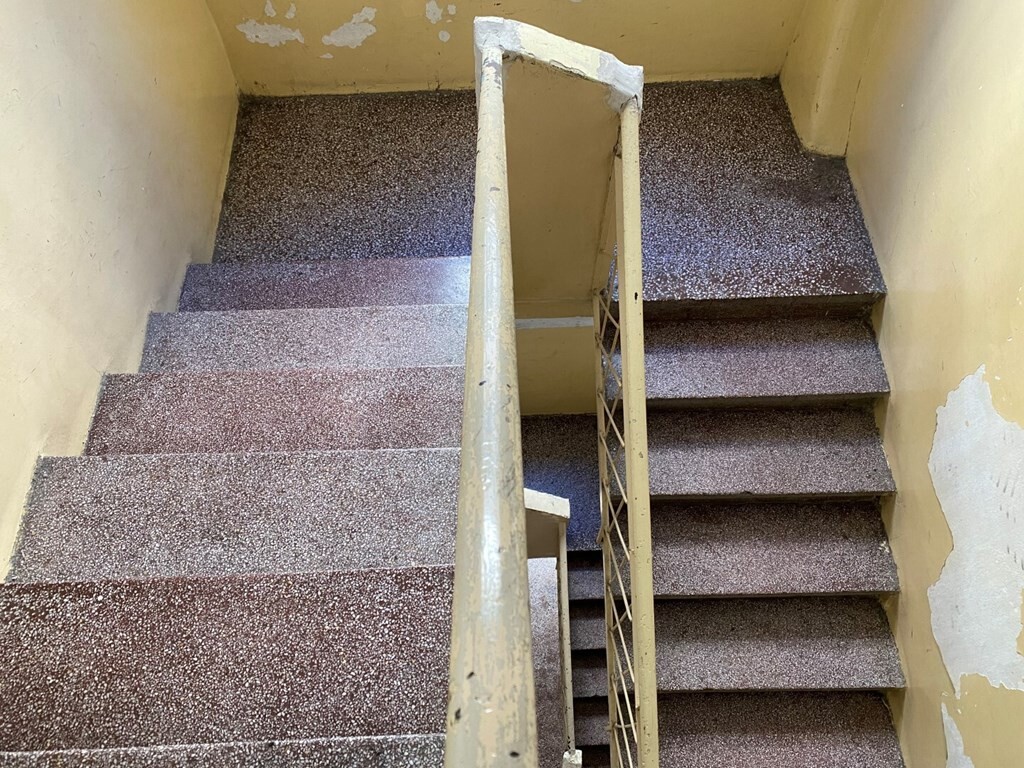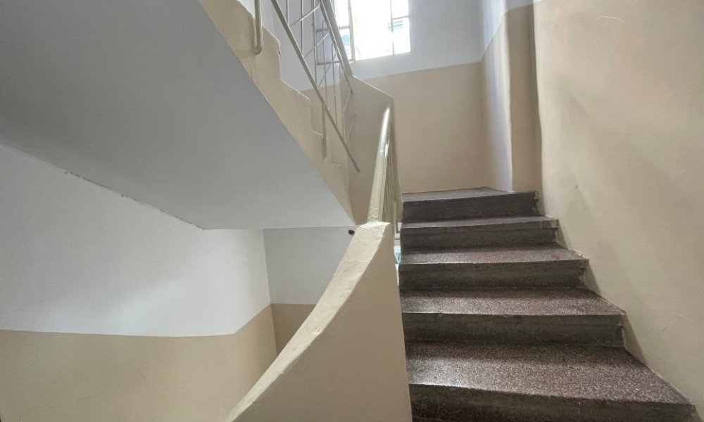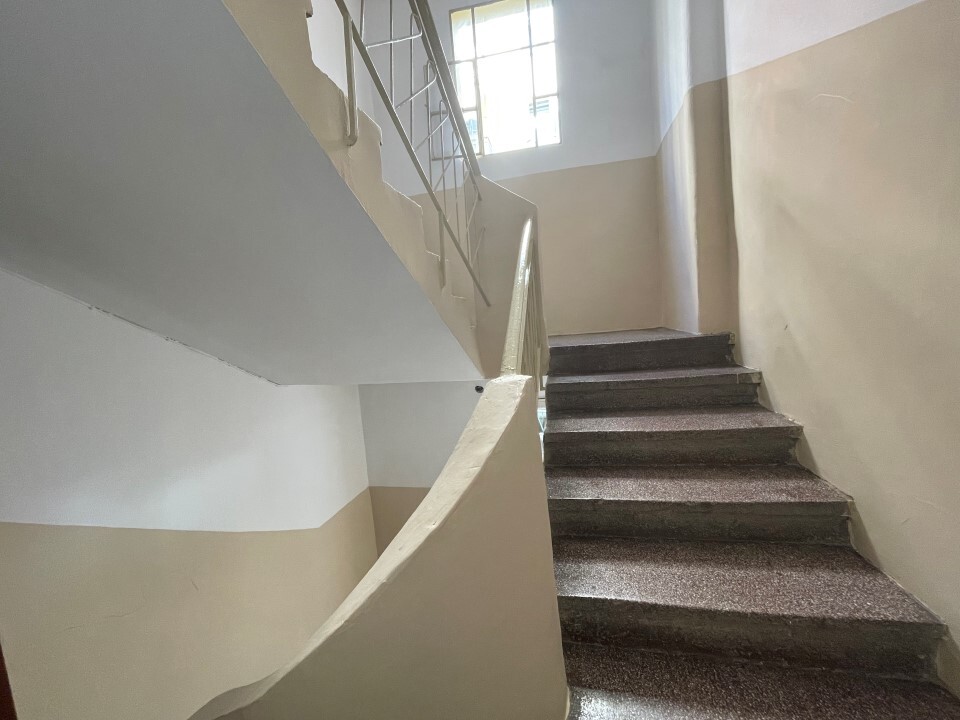 Flat has corner layout. A view of the city opens up from the windows. Building without elevator.