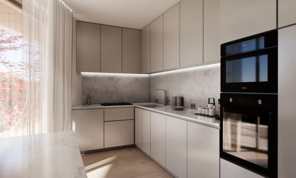 Flat has front layout. A view of the city opens up from the windows. There are: solar panels for water heating, air conditioning, heating. Building has an elevator.