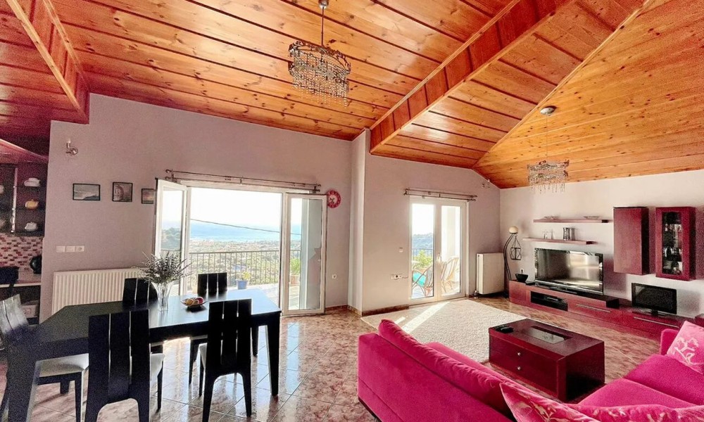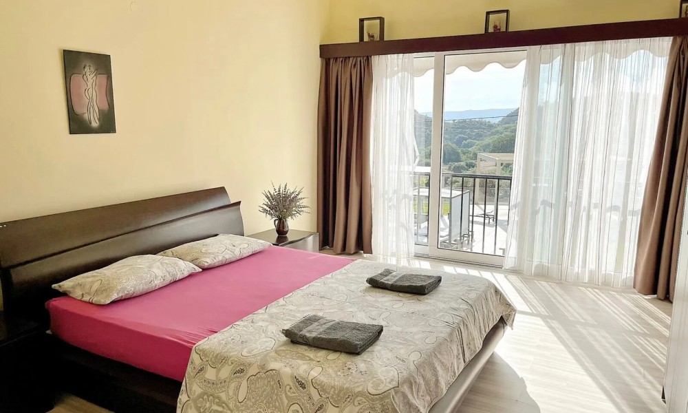 Flat has front layout. A magnificent view of the city, the sea, the mountain, the forest opens up from the windows. There are: solar panels for water heating, a fireplace, air conditioning, heating. The owners will be leaving the furniture with the sale. Building without elevator. Extras included with the property: parking space, garden, garage.