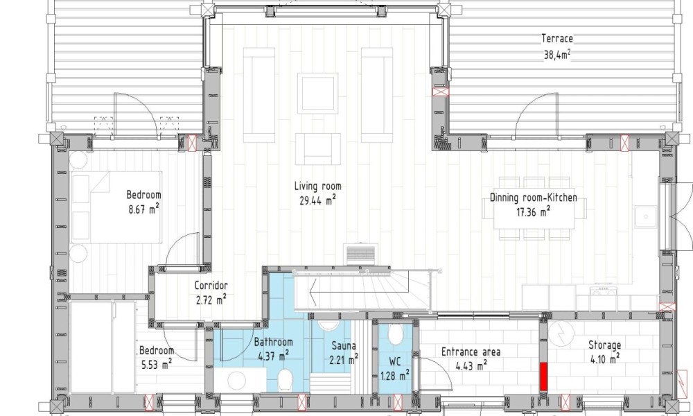 The first floor features half-timbered timber with vertical panels, offering increased flexibility in room layout and cabin furnishing. This floor showcases a modern appearance with its vertical wall panels, while the second floor exudes traditional loft style, characterized by horizontal logs. The use of normal trusses on the first floor allows for versatile room division, preserving a modern aesthetic. Yet, the timber walls on the second floor, along with robust roof ridges, retain the cottage’s timeless traditional charm.