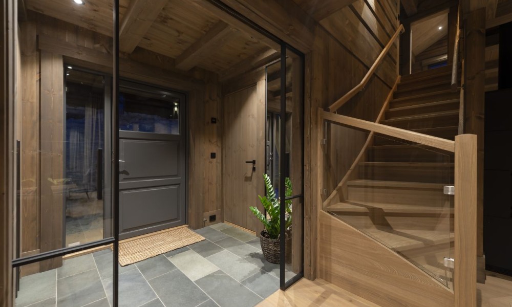 This mountain retreat features an entryway with ample storage and a convenient guest toilet. Adjacent to the entrance, there’s external access to a storage room.