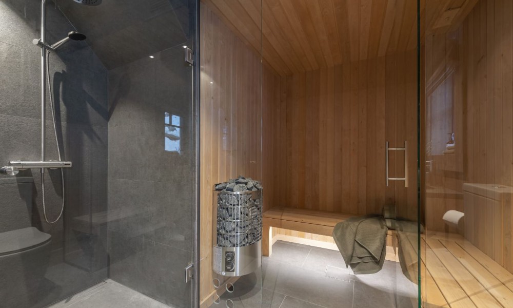 The cabin features underfloor heating on the first floor and in the bathroom on the second floor. Additionally, the other rooms on the second floor are equipped with sleek black panel ovens mounted on the walls. Standard amenities include remote heating control, enabling easy adjustment for a cozy environment.