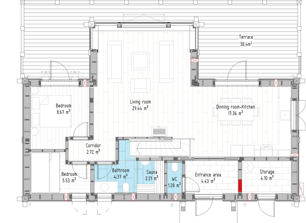The first floor features half-timbered timber with vertical panels, offering increased flexibility in room layout and cabin furnishing. This floor showcases a modern appearance with its vertical wall panels, while the second floor exudes traditional loft style, characterized by horizontal logs. The use of normal trusses on the first floor allows for versatile room division, preserving a modern aesthetic. Yet, the timber walls on the second floor, along with robust roof ridges, retain the cottage’s timeless traditional charm.