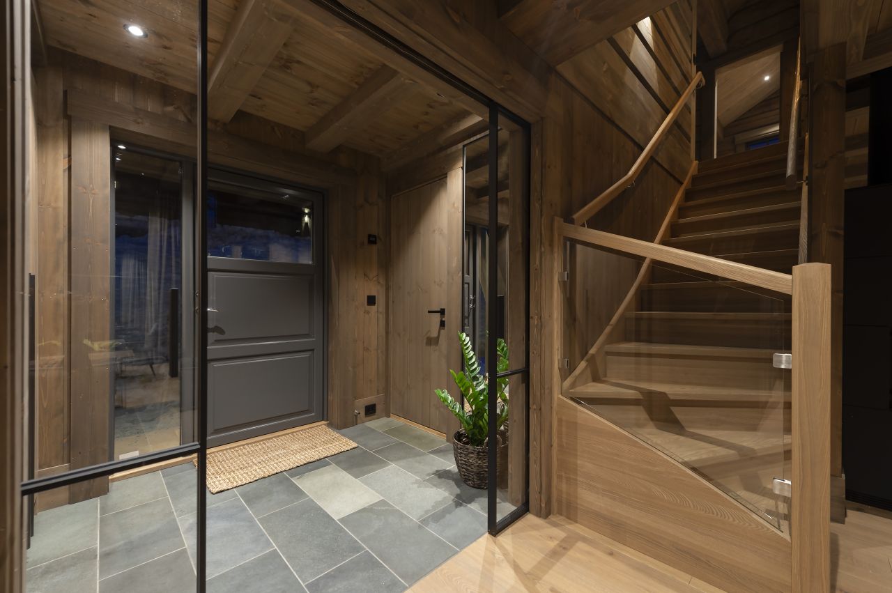 This mountain retreat features an entryway with ample storage and a convenient guest toilet. Adjacent to the entrance, there’s external access to a storage room.
