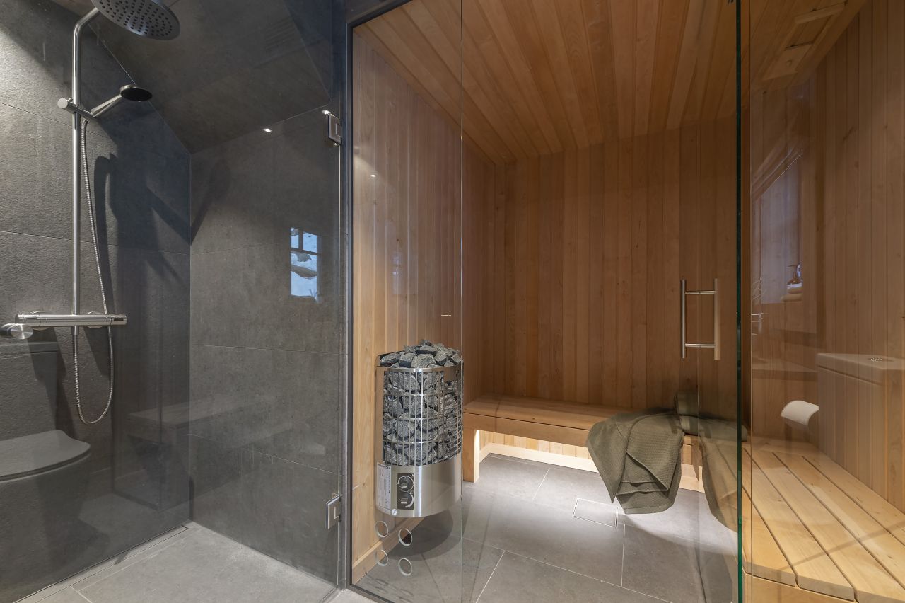 The kitchen, custom-made by LHM Interiør, combines durability and refined design. It maximizes space with soft-close drawers, LED lighting in display cabinets, and efficient sensor-controlled illumination. Furnished with top-tier Egger materials, including oak laminated fronts and a Decton Laos 20mm quartz composite worktop, it houses premium Franke and Dornbracht fixtures. Miele and Temptech appliances, modern Blum hardware, and a comprehensive source sorting system complete this state-of-the-art kitchen.BATHROOMS