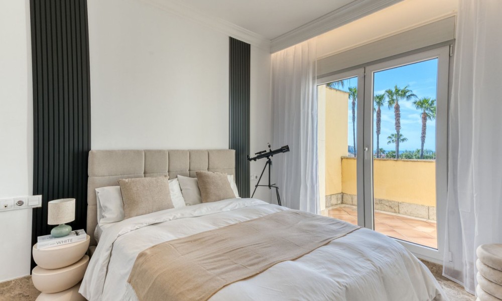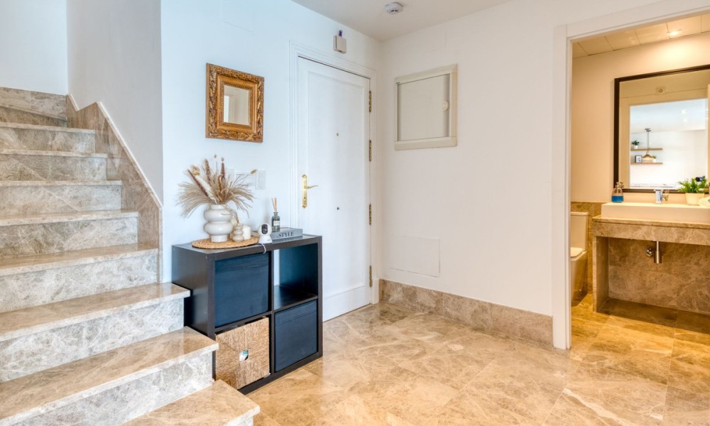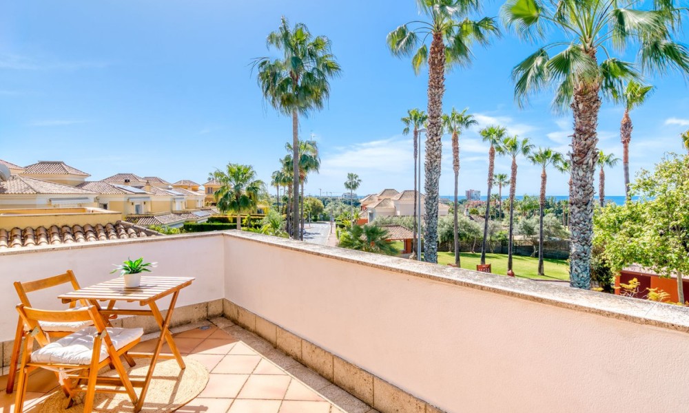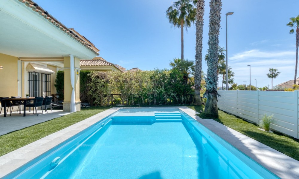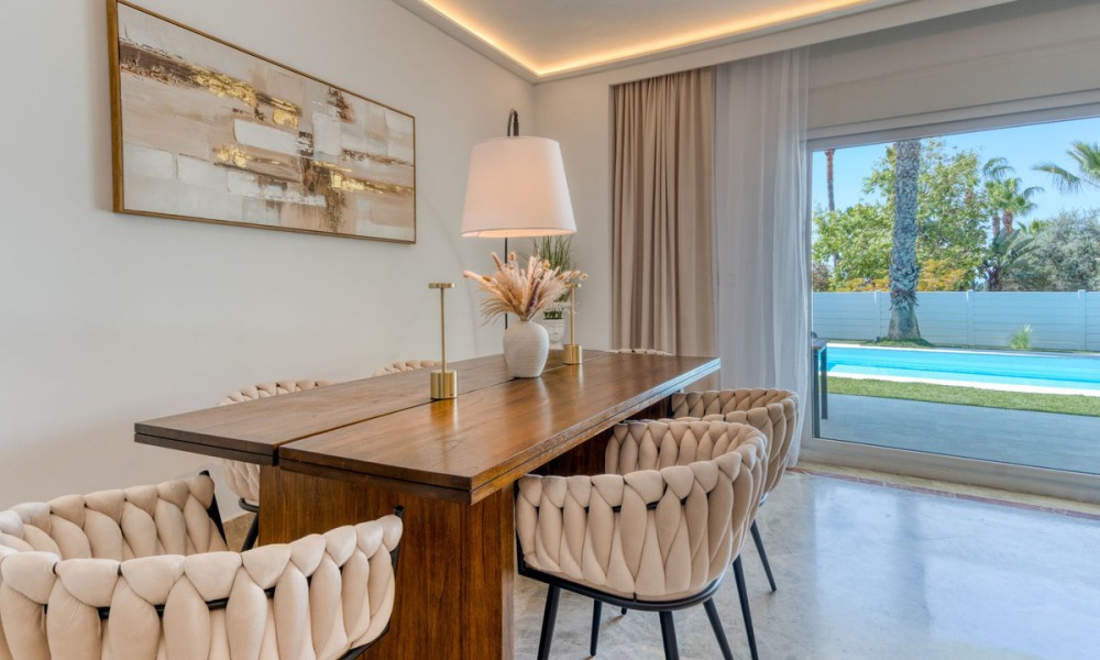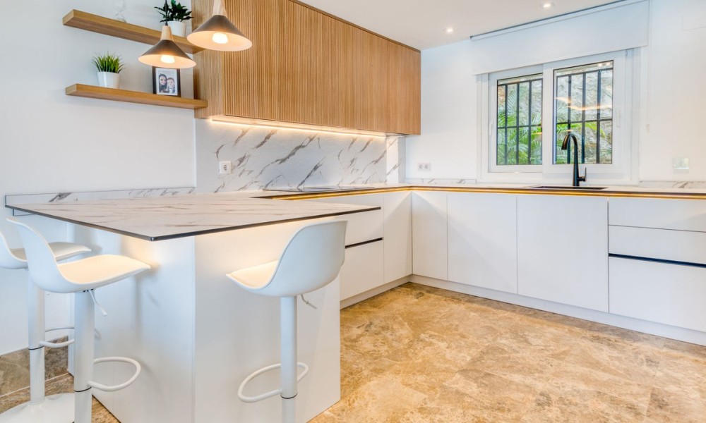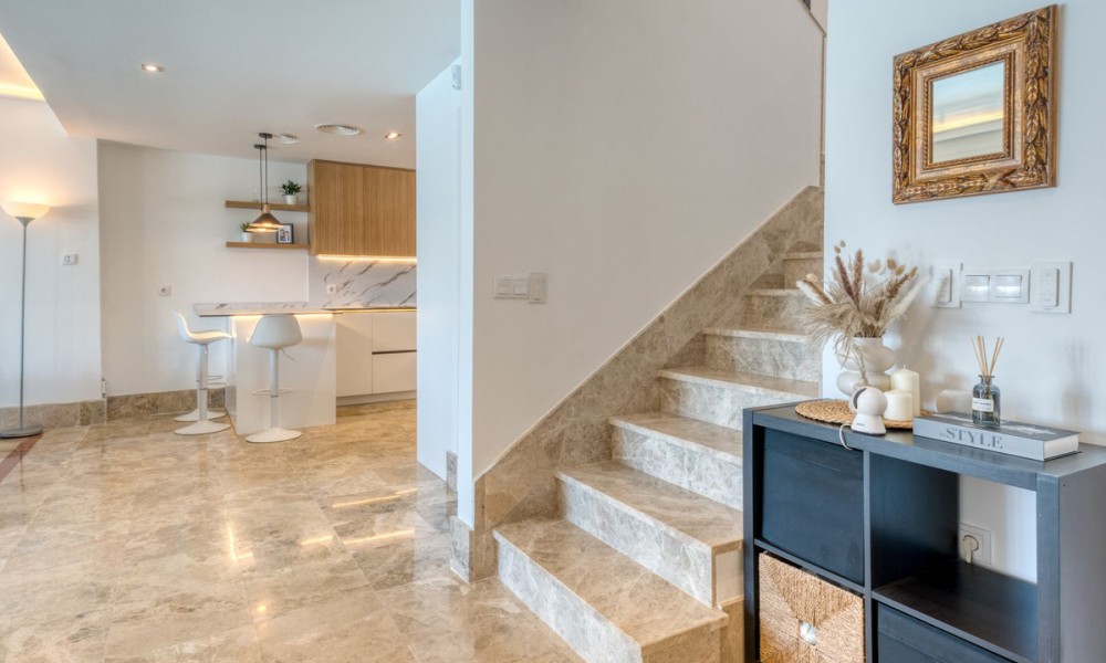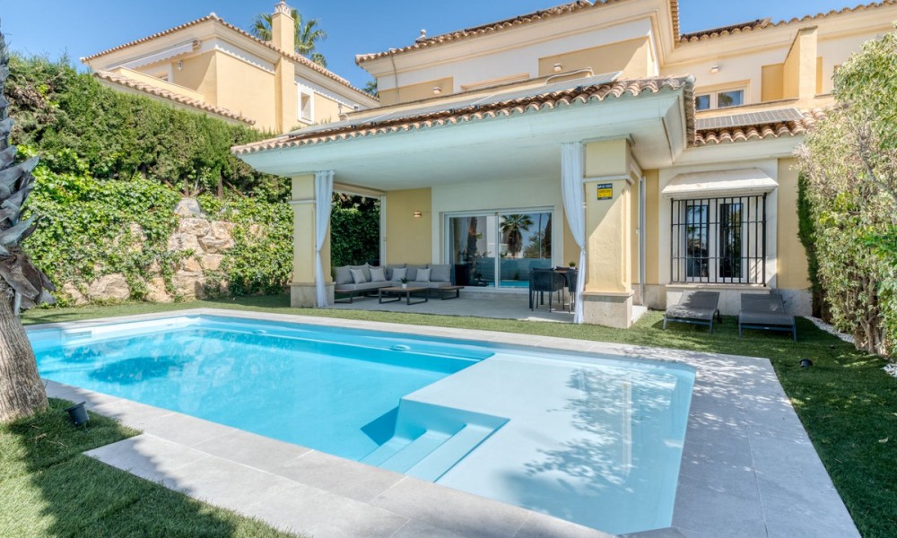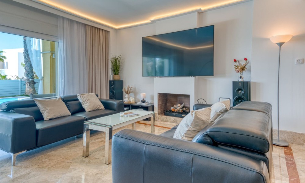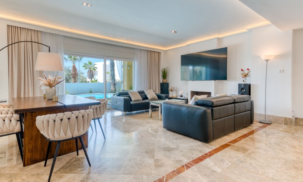 Contemporary Semi-Detached Villa with Sea Views and Smart Technology | MarbellaSet within an exclusive residential area in Marbella, this beautifully reformed semi-detached villa combines modern design, advanced technology and energy-efficient living to create a high-quality contemporary home. The interior has been thoughtfully redesigned to offer bright, open-plan living spaces, centred around an elegant living and dining area with a fully integrated kitchen. Large windows maximise natural light and connect seamlessly to the outdoor terraces and garden, while also offering pleasant sea views from the main living areas.The villa offers four spacious bedrooms, three with en suite bathrooms, alongside a fourth bedroom served by a separate bathroom, providing a practical layout for both family living and guests.