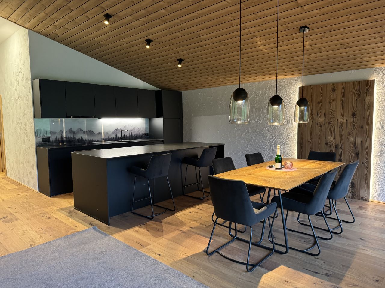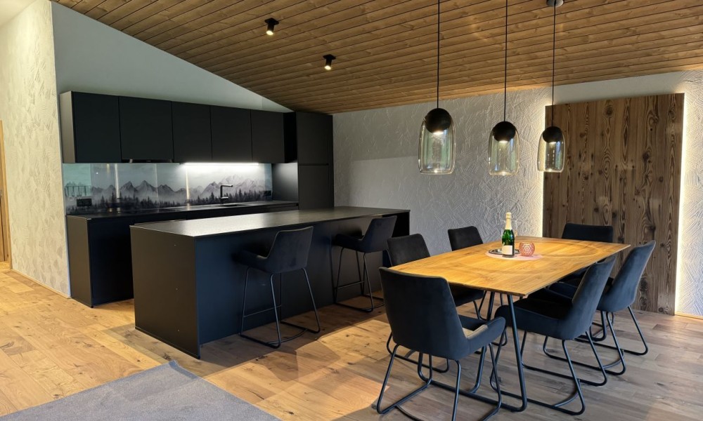 The apartment has two elegant bedrooms, one of which has an en-suite spa bathroom – the perfect combination of luxury and cosiness. Another separate feel-good bathroom provides additional comfort.The open-plan living and dining area boasts a stunning panoramic window front that offers unforgettable views of the picturesque mountain landscape. The modern, branded kitchen is not only a visual highlight, but also perfectly equipped in terms of functionality.