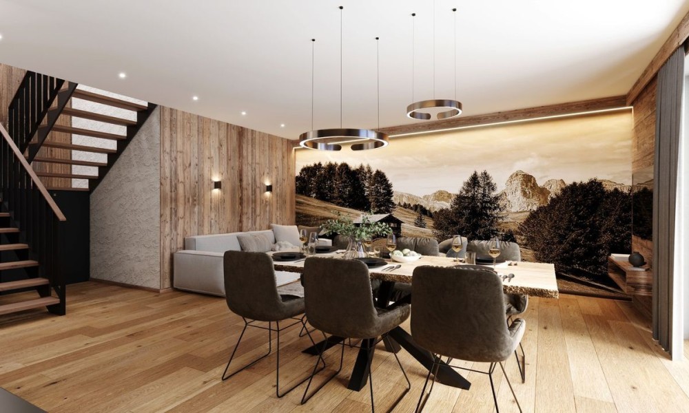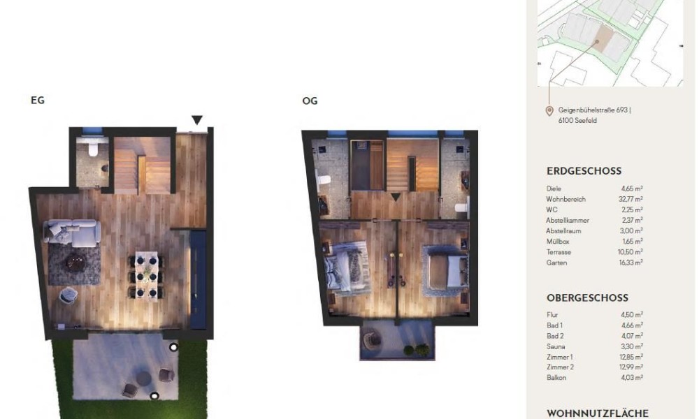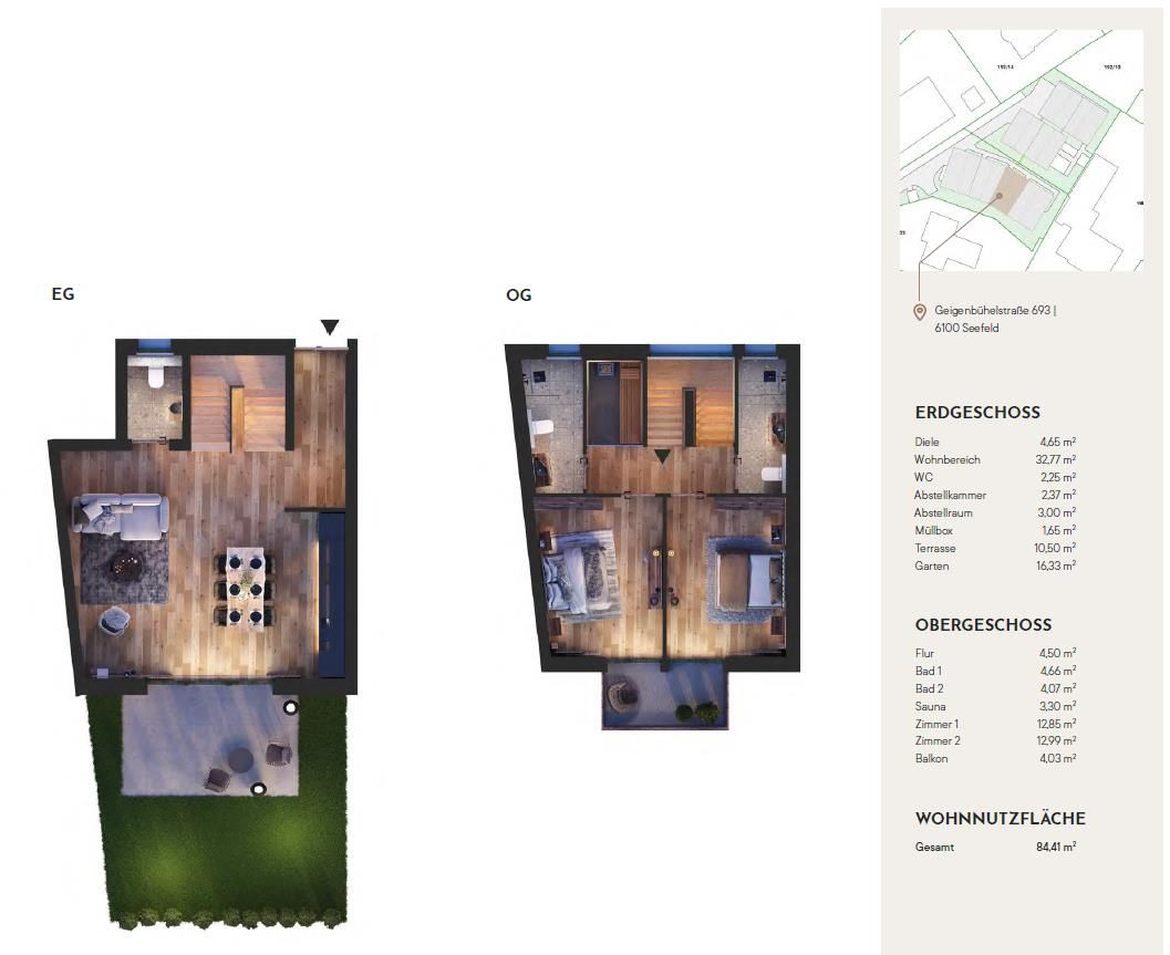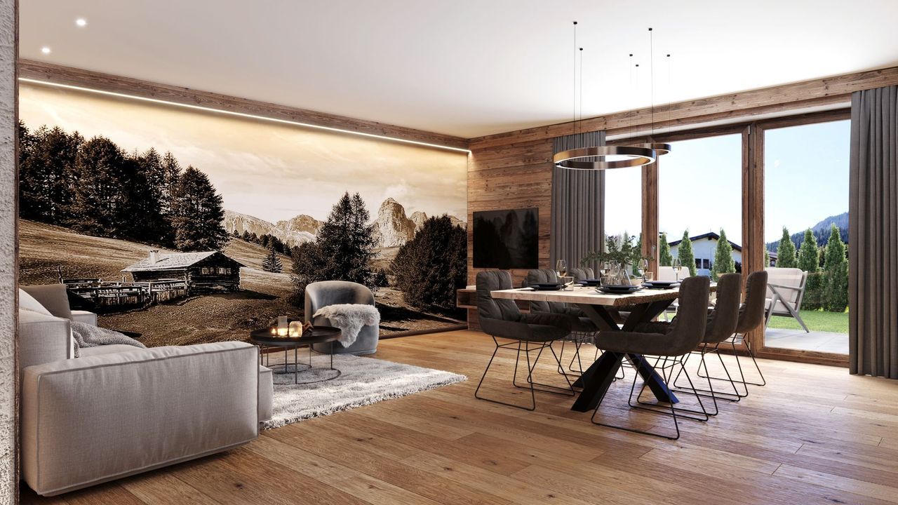 The use of renowned international brand manufacturers is particularly noteworthy. Each chalet has a sophisticated lighting concept and designer lamps from Occhio, box-spring beds from Setra, which also furnish luxury hotels such as the Ritz Carlton, designer chairs from Freifrau, carpentry kitchens and kitchen appliances from Siemens StudioLine and many other highlights – quality that makes all the difference. The chaletThe beautifully situated chalet TOP 3 in the front row offers a perfect balance between accessibility and seclusion. It spoils you with a picturesque view and at the same time offers easy access to the car park.The chalet offers an inviting and spacious atmosphere. Upon entering the chalet, you immediately notice the open-plan concept and the spacious level that includes the kitchen, dining area and living room. This open-plan design creates a cosy atmosphere for shared meals and social gatherings. Access to the private south-facing terrace and garden invites you to relax outdoors and offers beautiful views of the Tyrolean mountains. There is also a guest toilet on this level.An open staircase leads to the two bedrooms, each of which has its own bathroom and access to the balcony. These private retreats offer comfort and privacy for every guest. There is also a private sauna, perfect for relaxing moments after a day of outdoor activities. Furthermore, each chalet has its own sports equipment room with space for bikes or skis. A special highlight is the integrated ski boot warmer. Each chalet has its own car park to make it easy for guests to arrive by car or park their vehicle. All in all, Chalet TOP 3 offers an ideal combination of comfort, functionality and luxurious furnishings for an unforgettable holiday.Don’t hesitate to contact us, we will be happy to answer your questions at any time!The SUITES Seefeld Lodges are run by the locally renowned operator PEAK STAY, which is known for its excellent quality and provides you with an all-round carefree package. This investment forecasts an attractive return of 4 to 6 % per year as well as protection against inflation due to the increase in value of the property.Net purchase price € 819,000.00