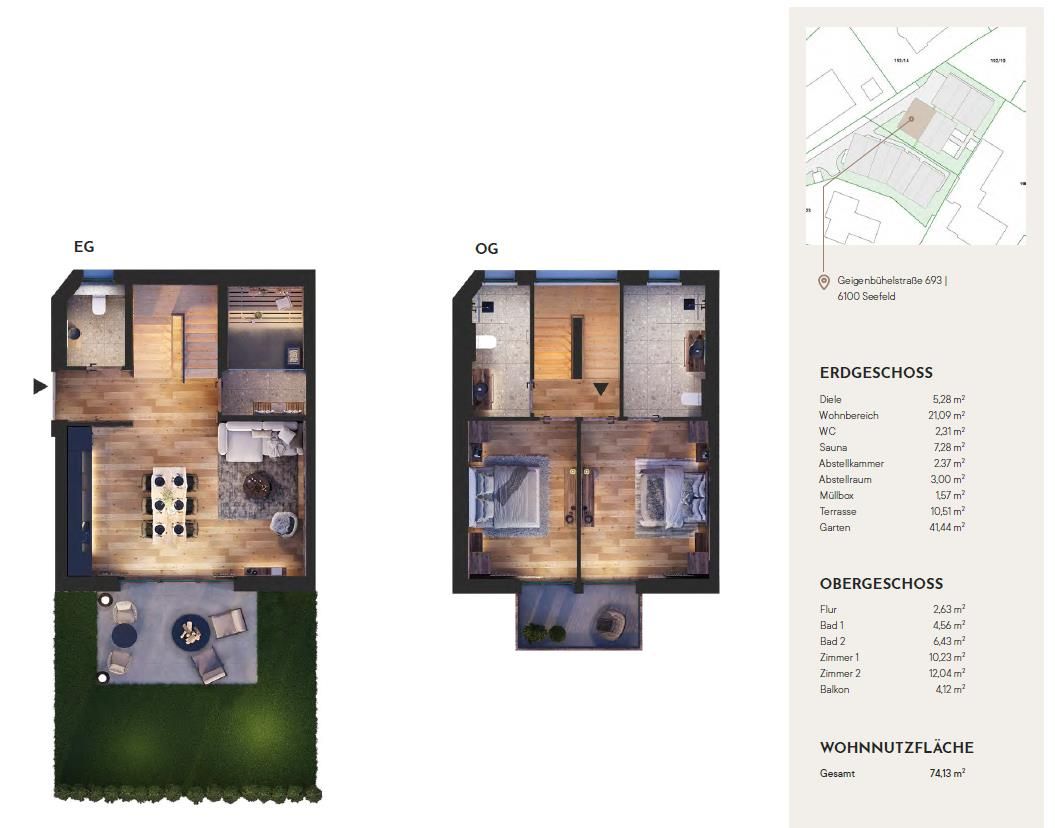 On this level there is also a guest toilet and a private sauna, perfect for relaxing moments after a day of outdoor activities.An open staircase leads to the two bedrooms, each of which has its own bathroom and private access to the balcony. These private retreats offer comfort and privacy for every guest.In addition, each chalet has its own sports equipment room with space for bicycles or skis. A special highlight is the integrated ski boot warmer. Each chalet has its own car park to make it easy for guests to arrive by car or park their vehicle. All in all, Chalet TOP 5 offers an ideal combination of comfort, functionality and luxurious furnishings for an unforgettable holiday.Please do not hesitate to contact us, we will be happy to answer your questions at any time!The SUITES Seefeld Lodges are run by the locally renowned operator PEAK STAY, which is known for its excellent quality and provides you with an all-round carefree package. This investment forecasts an attractive return of 4 to 6 % per year as well as protection against inflation due to the increase in value of the property.Net purchase price €779,000.00