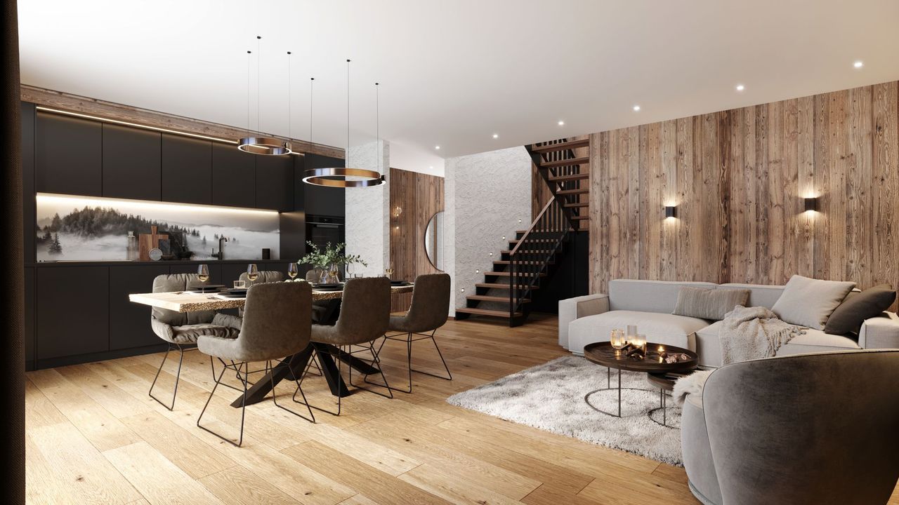 The use of renowned international brand manufacturers is particularly noteworthy. Each chalet has a sophisticated lighting concept and designer lamps from Occhio, box-spring beds from Setra, which also furnish luxury hotels such as the Ritz Carlton, designer chairs from Freifrau, carpentry kitchens and kitchen appliances from Siemens StudioLine and many other highlights – quality that makes all the difference. The chaletChalet TOP 5 on the far left-hand side is not only located in the centre of the chalet village, but also boasts a breathtaking view of the mountain landscape. With direct access to the car park, it is still easy to reach.The chalet offers an inviting and spacious atmosphere. Upon entering the chalet, you immediately notice the open-plan concept and the spacious level, which includes the kitchen, dining area and living room. This open-plan design creates a cosy atmosphere for shared meals and social gatherings. Access to the private south-facing terrace and garden invites you to relax outdoors and offers beautiful views of the Tyrolean mountains.