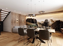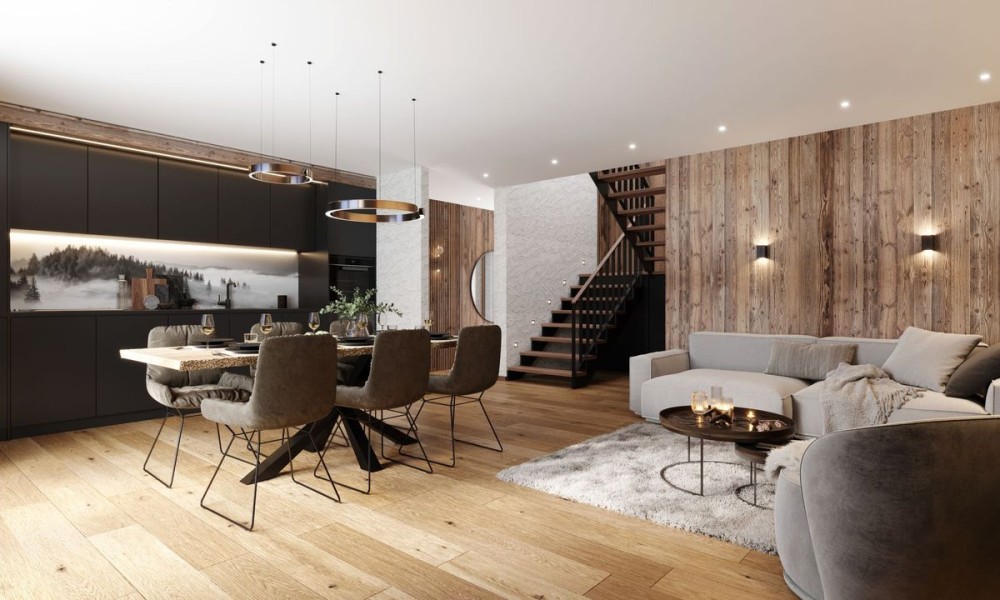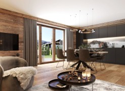The use of renowned international brand manufacturers is particularly noteworthy. Each chalet has a sophisticated lighting concept and designer lamps from Occhio, box-spring beds from Setra, which also furnish luxury hotels such as the Ritz Carlton, designer chairs from Freifrau, carpentry kitchens and kitchen appliances from Siemens StudioLine and many other highlights – quality that makes all the difference. The chaletThe TOP 7 chalet offers a harmonious combination of accessibility and seclusion. Not only is it located on the far right-hand edge with direct access to the car park, it also boasts a breathtaking view of the mountain landscape. Its elevated and quiet location gives it a sublime atmosphere that promises undisturbed relaxation.The chalet offers an inviting and spacious atmosphere. Upon entering the chalet, you immediately notice the open-plan concept and the spacious level, which includes the kitchen, dining area and living room. This open-plan design creates a cosy atmosphere for shared meals and social gatherings. Access to the private south-facing terrace and garden invites you to relax outdoors and offers beautiful views of the Tyrolean mountains.