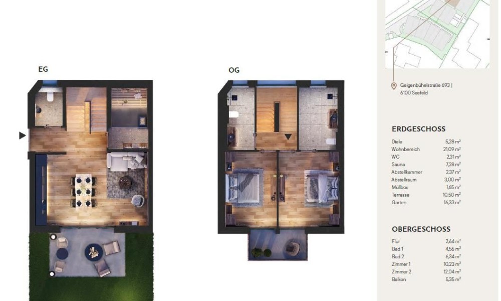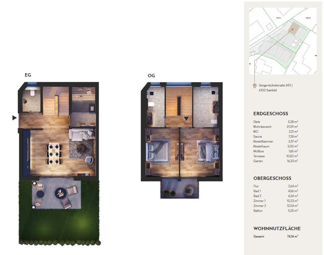 On this level there is also a guest toilet and a private sauna, perfect for relaxing moments after a day of outdoor activities.An open staircase leads to the two bedrooms, each of which has its own bathroom and private access to the balcony. These private retreats offer comfort and privacy for every guest.In addition, each chalet has its own sports equipment room with space for bicycles or skis. A special highlight is the integrated ski boot warmer. Each chalet has its own car park to make it easy for guests to arrive by car or park their vehicle. All in all, Chalet TOP 7 offers an ideal combination of comfort, functionality and luxurious furnishings for an unforgettable holiday.Don’t hesitate to contact us, we will be happy to answer your questions at any time!The SUITES Seefeld Lodges are run by the locally renowned operator PEAK STAY, which is known for its excellent quality and provides you with an all-round carefree package. This investment forecasts an attractive return of 4 to 6 % per year as well as protection against inflation due to the increase in value of the property.Net purchase price €779,000.00