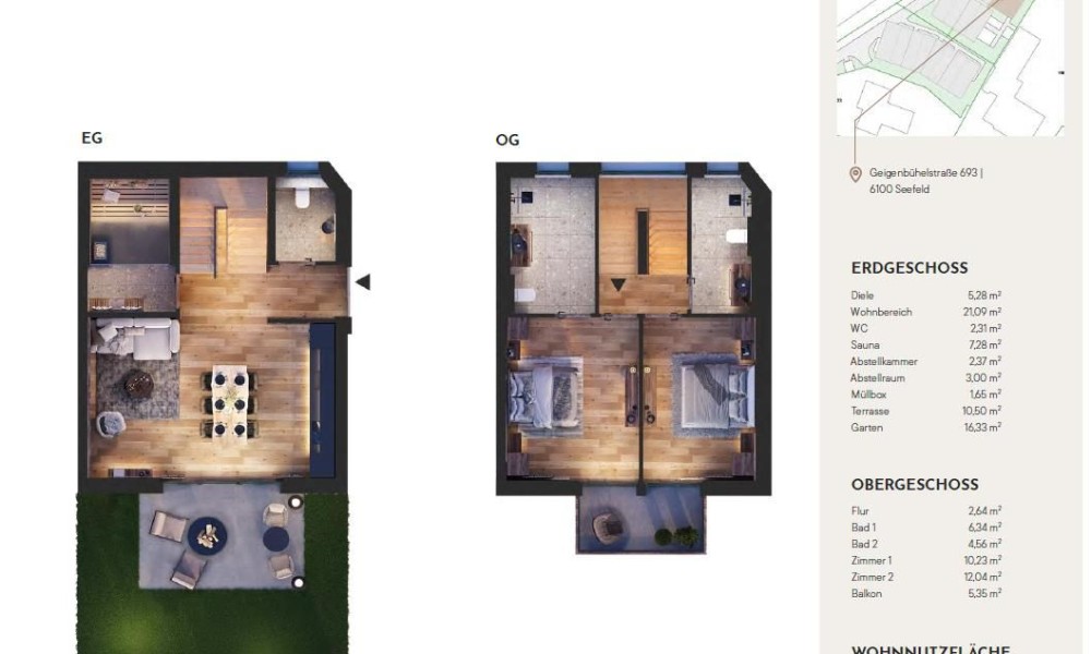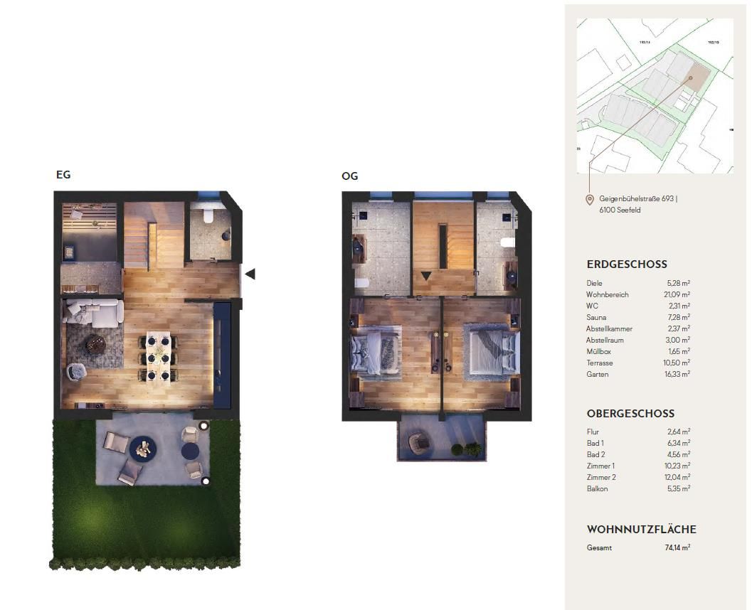 On this level there is also a guest toilet and a private sauna, perfect for relaxing moments after a day of outdoor activities.An open staircase leads to the two bedrooms, each of which has its own bathroom and private access to the balcony. These private retreats offer comfort and privacy for every guest.In addition, each chalet has its own sports equipment room with space for bicycles or skis. A special highlight is the integrated ski boot warmer. Each chalet has its own car park to make it easy for guests to arrive by car or park their vehicle. All in all, Chalet TOP 8 offers an ideal combination of comfort, functionality and luxurious furnishings for an unforgettable holiday.Don’t hesitate to contact us, we will be happy to answer your questions at any time!The SUITES Seefeld Lodges are run by the locally renowned operator PEAK STAY, which is known for its excellent quality and provides you with an all-round carefree package. This investment forecasts an attractive return of 4 to 6 % per year as well as protection against inflation through the increase in value of the property.Net purchase price €779,000.00