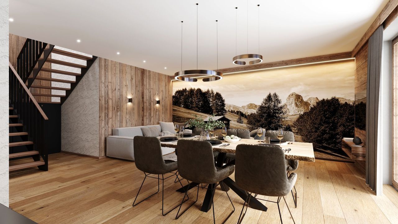 The use of renowned international brand manufacturers is particularly noteworthy. Each chalet has a sophisticated lighting concept and designer lamps from Occhio, box-spring beds from Setra, which also furnish luxury hotels such as the Ritz Carlton, designer chairs from Freifrau, carpentry kitchens and kitchen appliances from Siemens StudioLine and many other highlights – quality that makes all the difference. The chaletChalet TOP 8 offers an ideal balance between accessibility and seclusion. It impresses with its picturesque view and easy access to the car park. With its elevated and quiet location, it promises an unrivalled atmosphere of grandeur.The chalet offers an inviting and spacious atmosphere. Upon entering the chalet, you will immediately notice the open-plan concept and the spacious level, which includes the kitchen, dining area and living room. This open-plan design creates a cosy atmosphere for shared meals and social gatherings. Access to the private south-facing terrace and garden invites you to relax outdoors and offers beautiful views of the Tyrolean mountains.