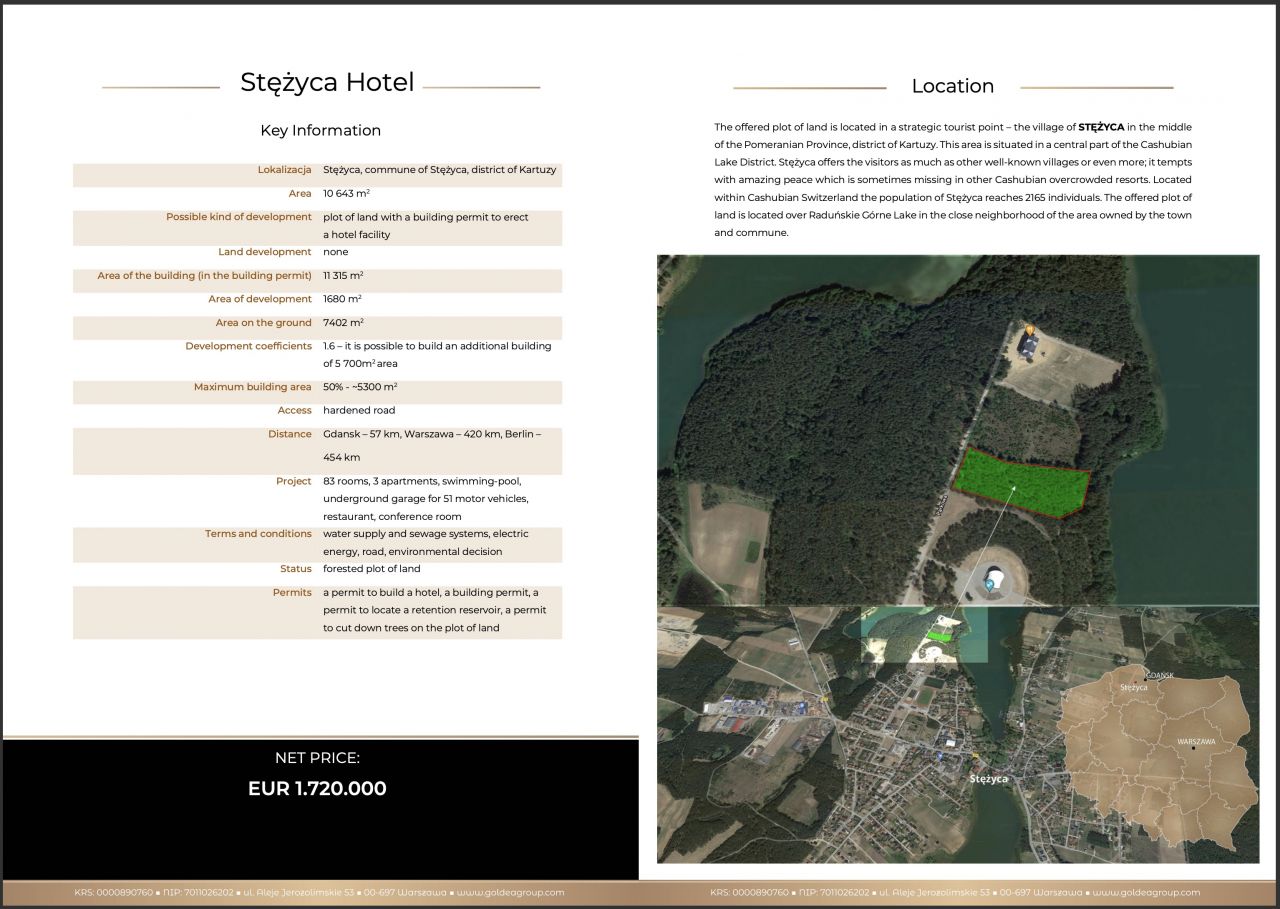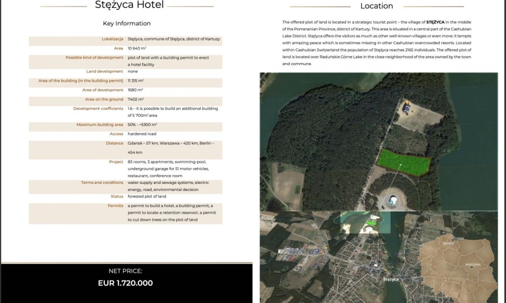 This offer refers to the sale of an investment plot of land, including a building permit to erect a hotel facility located in the village of Stężyca (District of Kartuzy) over Raduńskie Górne Lake.The offered plot of land is located in a strategic tourist point – the village of STĘŻYCA in the middle of the Pomeranian Province, district of Kartuzy. This area is situated in a central part of the Cashubian Lake District. Stężyca offers the visitors as much as other well-known villages or even more; it tempts with amazing peace which is sometimes missing in other Cashubian overcrowded resorts. Located within Cashubian Switzerland the population of Stężyca reaches 2165 individuals. The offered plot of land is located over Raduńskie Górne Lake in the close neighborhood of the area owned by the town and commune.Plot of land no 649/33 of 1.0643 ha is classified as a recreational area. The plot of land is described in the Land and Mortgage Register Kw GD1R/00028762/4. It is provided with the development conditions and local spatial development plan. Situated by Raduńskie Gorne Lake the land is separated from the lake by a plot of land owned by the commune and classified as a green area.