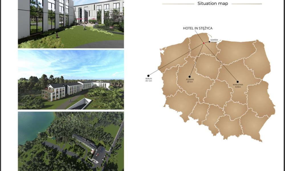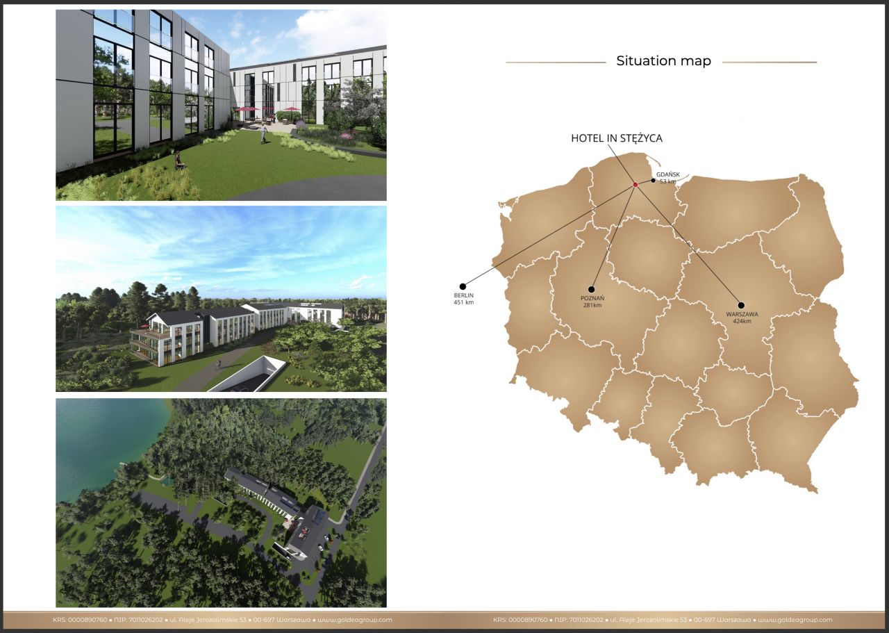 Now the plot of land offered for sale is a forest – the permit to cut down the trees growing on the real estate has been already issued by relevant authorities.Pursuant to the local spatial development plan referring to the fragment of the geodesic precinct of Stężyca the offered plot of land allows for increasing the development structure to a higher extent than the building permit describes. According to the land parameters about 30% of the development area and about 60% of the development intensity are used. It is possible to obtain an additional building permit for erecting a building of 5 700 m2 area.Within the obtained building permit it is possible to build a hotel facility of 11 315 m2 total area on the offered land. The 6-storey hotel will offer 83 rooms and 3 apartments. The development area reaches 1 680 m2. One storey will be under the ground (3 913 m2), 4 storeys and the attic (765 m2) – on the ground (1 665 m2). The underground part of the hotel will accommodate a garage for 51 motor vehicles.The obtained permit does not cover the potential of the plot. According to the local spatial development plan it is possible to erect more buildings on the offered plot.
