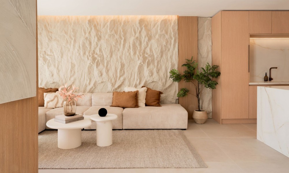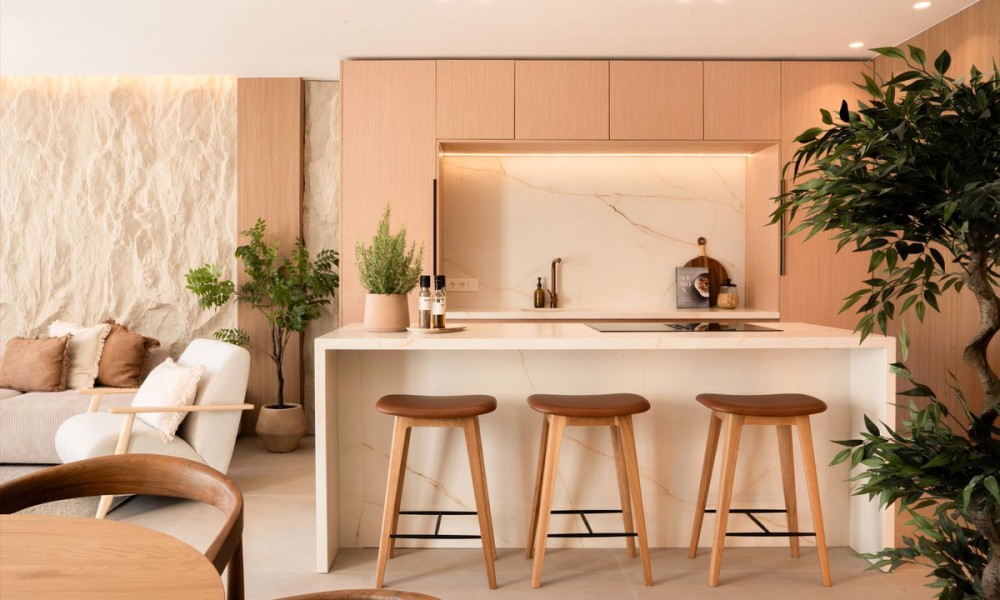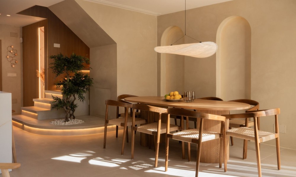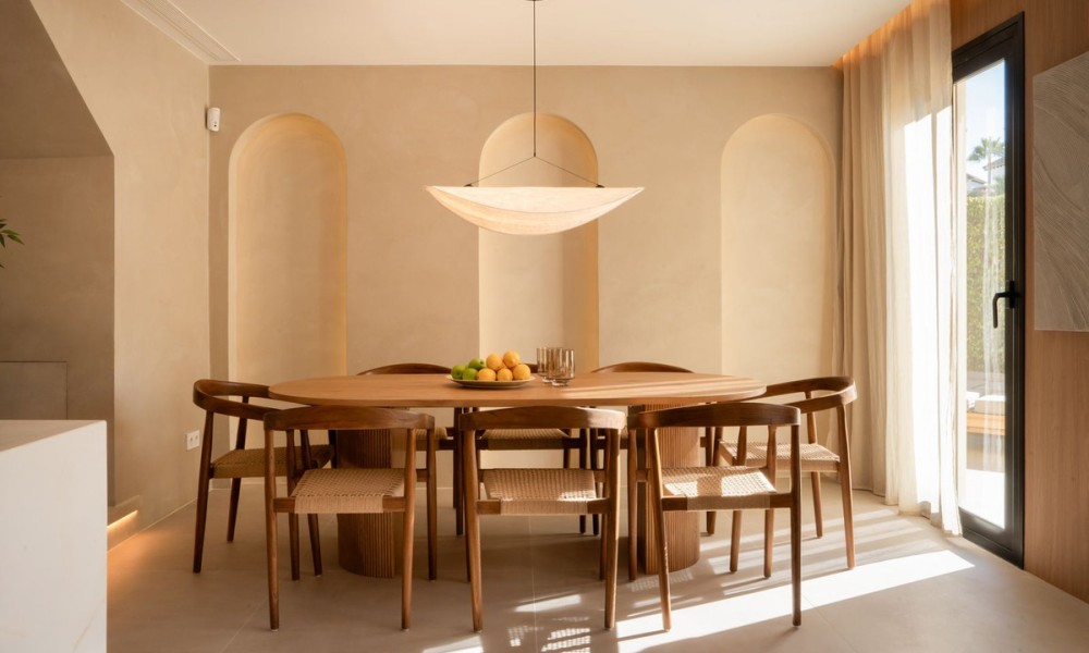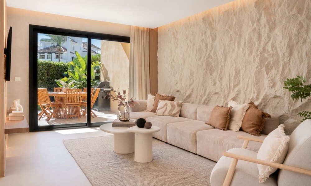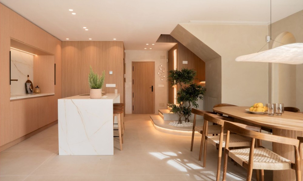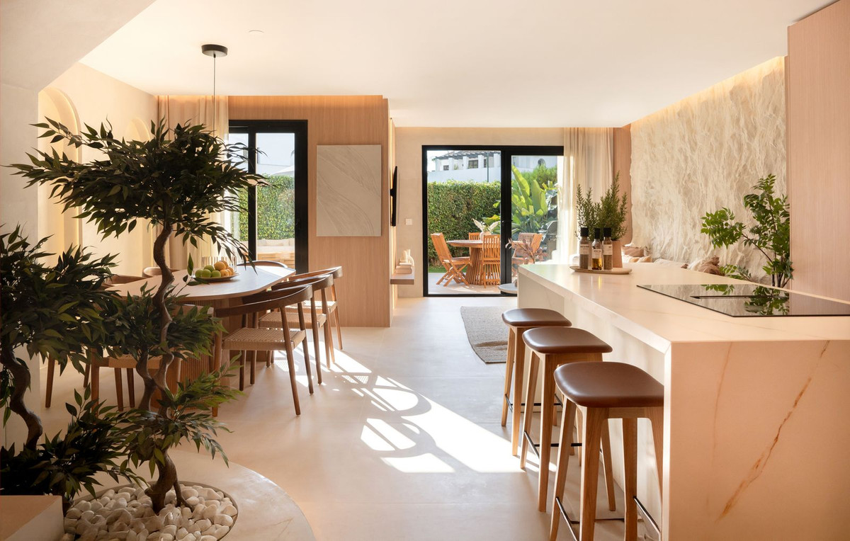 Refurbished Beachside Townhouse with Private Pool Close to Puerto Banús | MarbellaThis beautifully refurbished beachside townhouse combines contemporary design with an effortless coastal lifestyle just two hundred metres from the shoreline and within a short walk of Puerto Banús. Inside, the home showcases high quality finishes including microcement, bespoke carpentry, stone floors, and concealed LED lighting that create a refined and modern atmosphere. The open plan layout connects the kitchen, dining, and living areas with a natural flow, enhanced by glass doors that fill the home with light and extend the interior towards the private outdoor spaces.The property offers four bedrooms, one with an en suite bathroom, along with another full bathroom and a guest toilet. Underfloor heating in the bathrooms and an Airzone controlled climate system ensure complete comfort throughout the year.