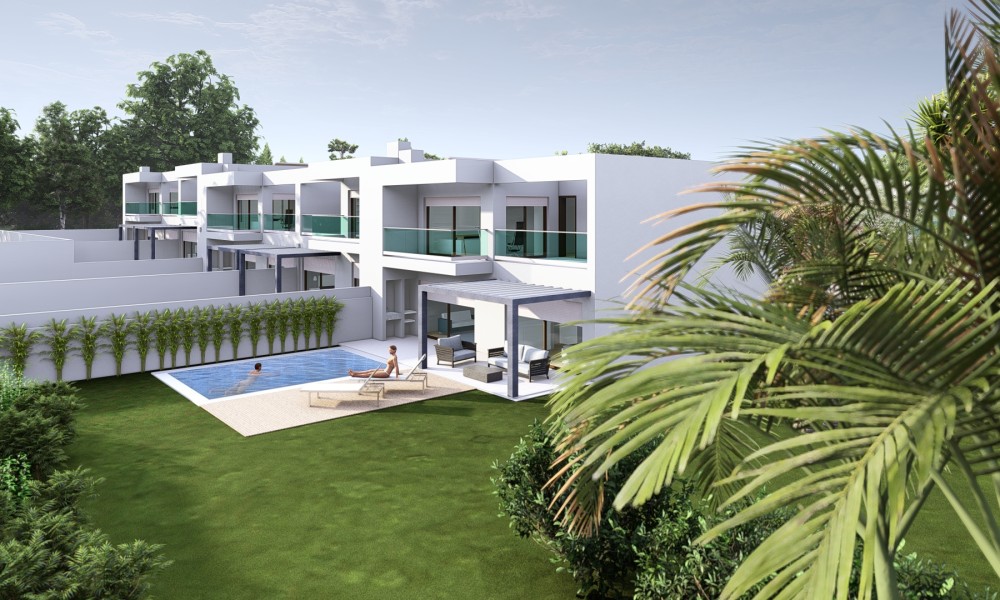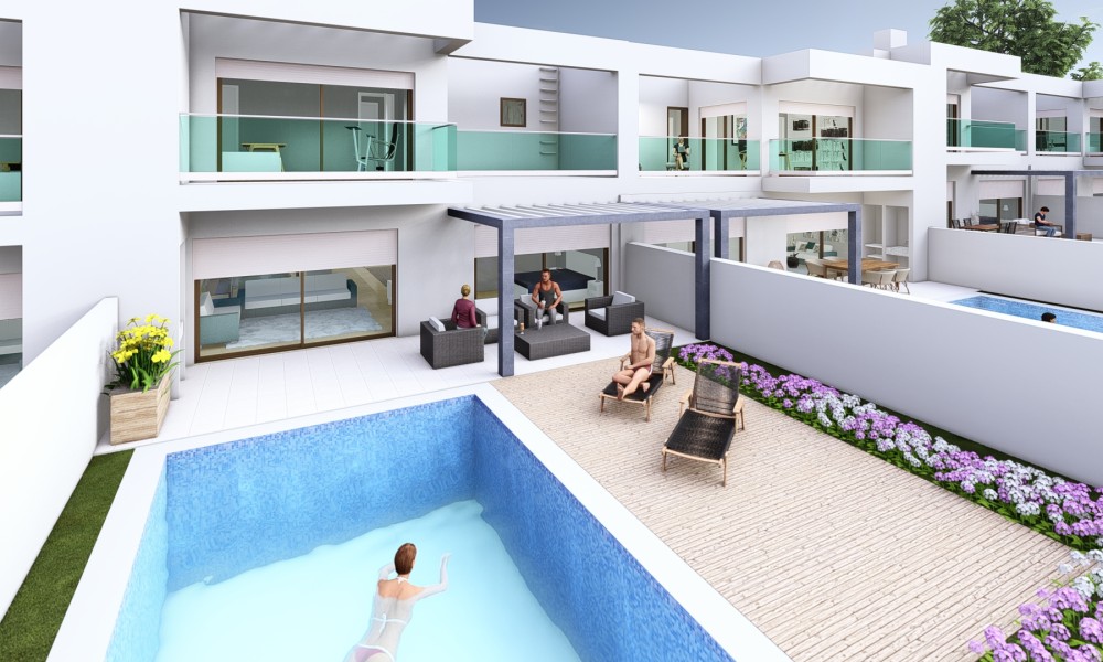 Nestled in the picturesque village of Almadena, a new era of urbanization is taking shape with the introduction of 10 exquisite luxury villas. This modern collection of off-plan, two-storey townhouses feature spacious designs with 3 bedrooms plus an office, perfect for contemporary living. Each unit boasts a sunny terrace and a garage, with the option to include a swimming pool.Ground Floor: The entry opens into a welcoming hall that flows seamlessly into an open concept living and dining area, complemented by a state-of-the-art kitchen that extends to an inviting sunny terrace. The ground floor also includes a well-appointed bedroom and a stylish bathroom, along with a staircase leading to the upper level. Additionally, there is a garage designed for one vehicle, with outdoor terraces that can be enhanced with a 29 sqm pool and a deck for relaxation.Upper Floor: The second floor features a private entrance that leads to two generously sized bedrooms, each with its own ensuite bathrooms.