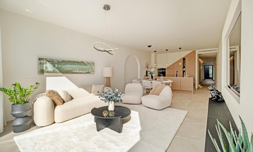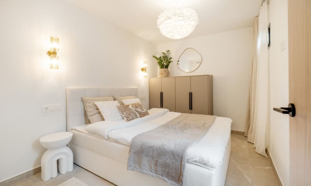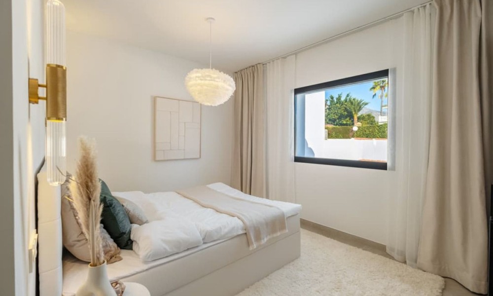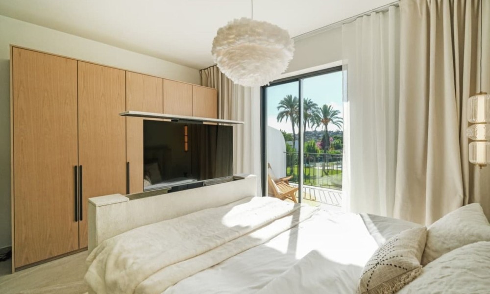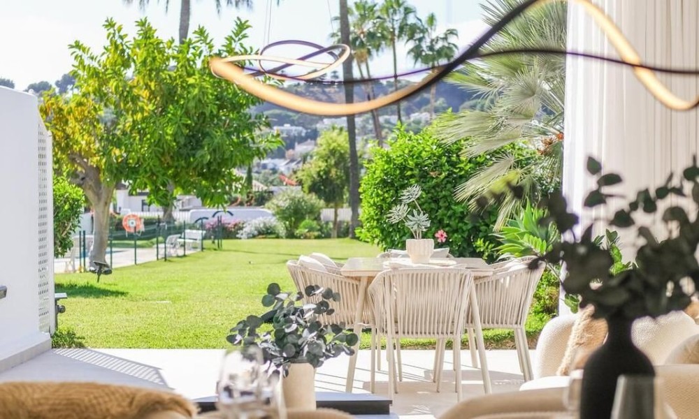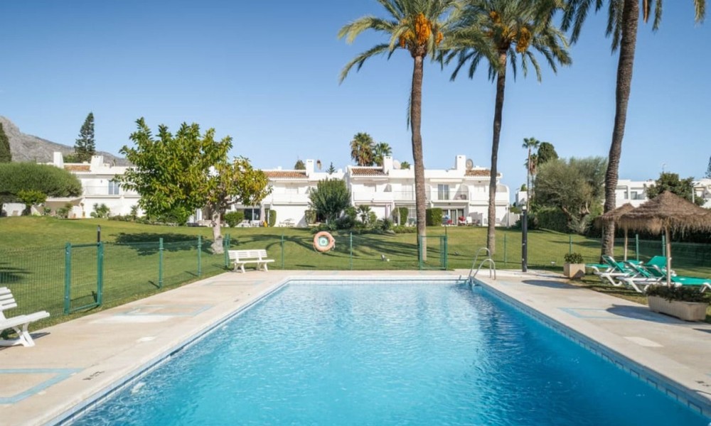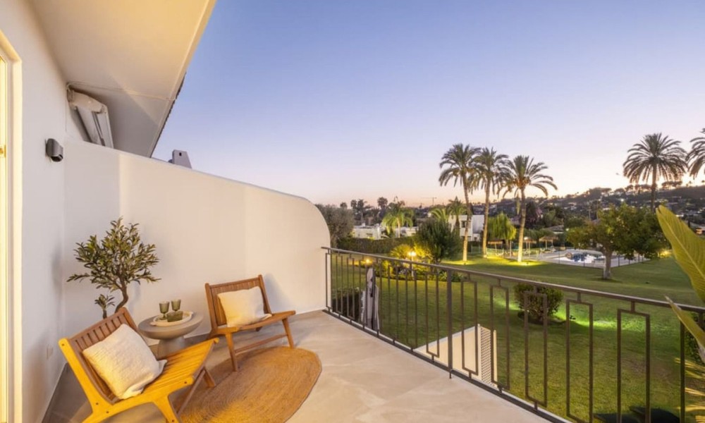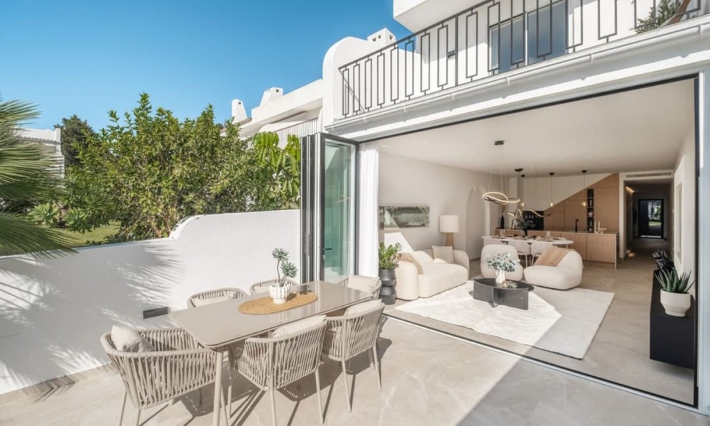 Fully Refurbished Townhouse | Aloha, Nueva AndalucíaSet within a charming Andalusian-style gated community in the heart of Nueva Andalucía’s Golf Valley, this beautifully refurbished townhouse combines contemporary design with timeless Mediterranean appeal. Soft neutral tones, clean architectural lines and high-quality finishes create a calm and elegant living environment throughout.Arranged over two levels, the home offers a bright and well-balanced layout. The garden level features a welcoming entrance patio, hallway and an open-plan living and dining area with a sleek, fully fitted designer kitchen. Large sliding doors open seamlessly onto the terrace and private garden, with direct access to the immaculately maintained communal gardens and swimming pool.Upstairs, the generous master suite enjoys an en-suite bathroom and a private terrace with views across the gardens, pool, Golf Valley and surrounding mountains.