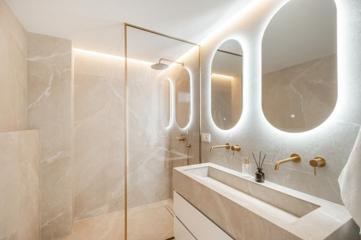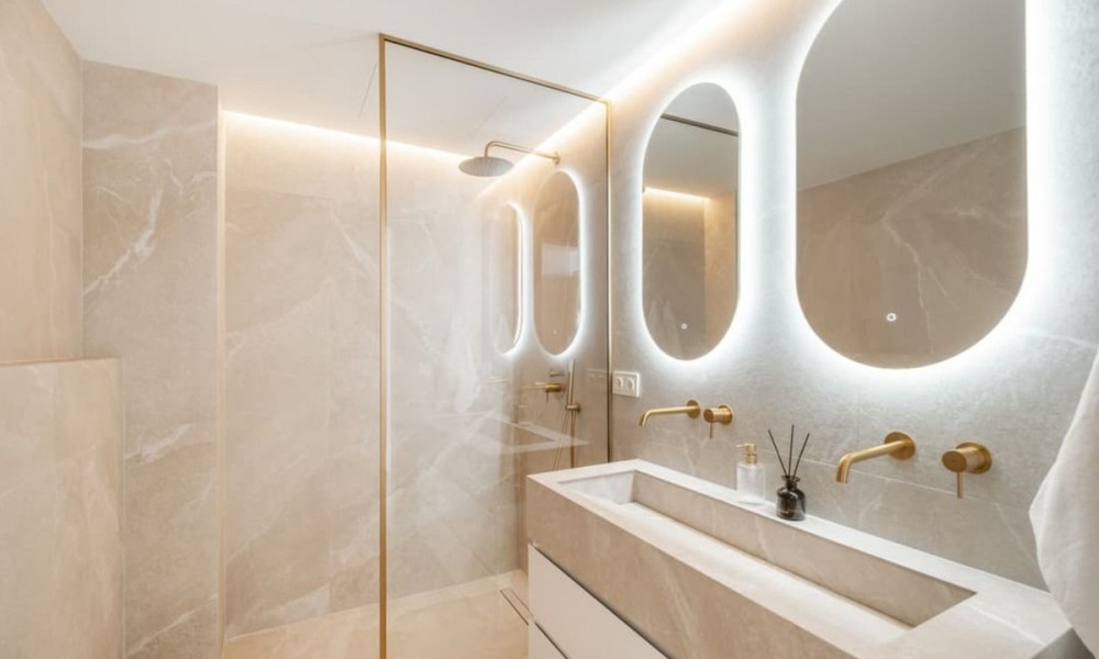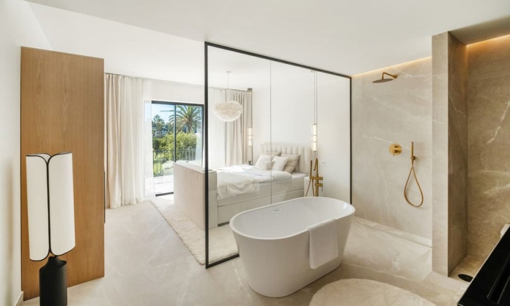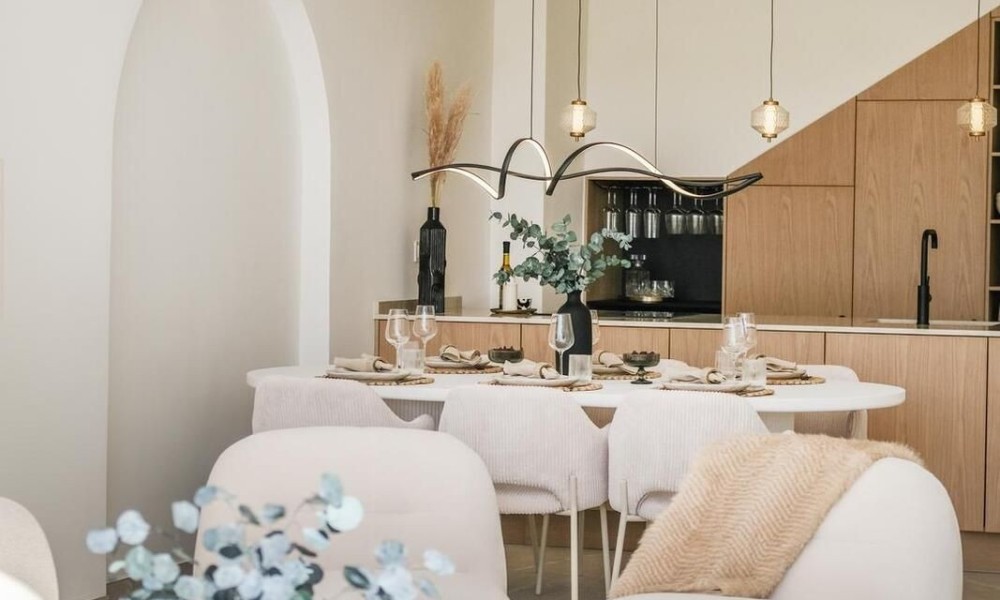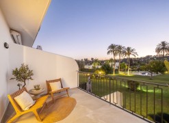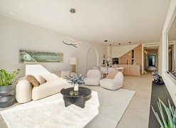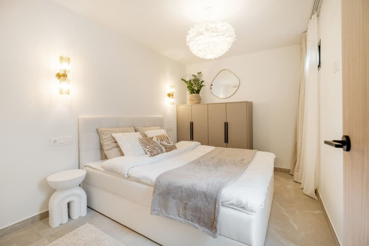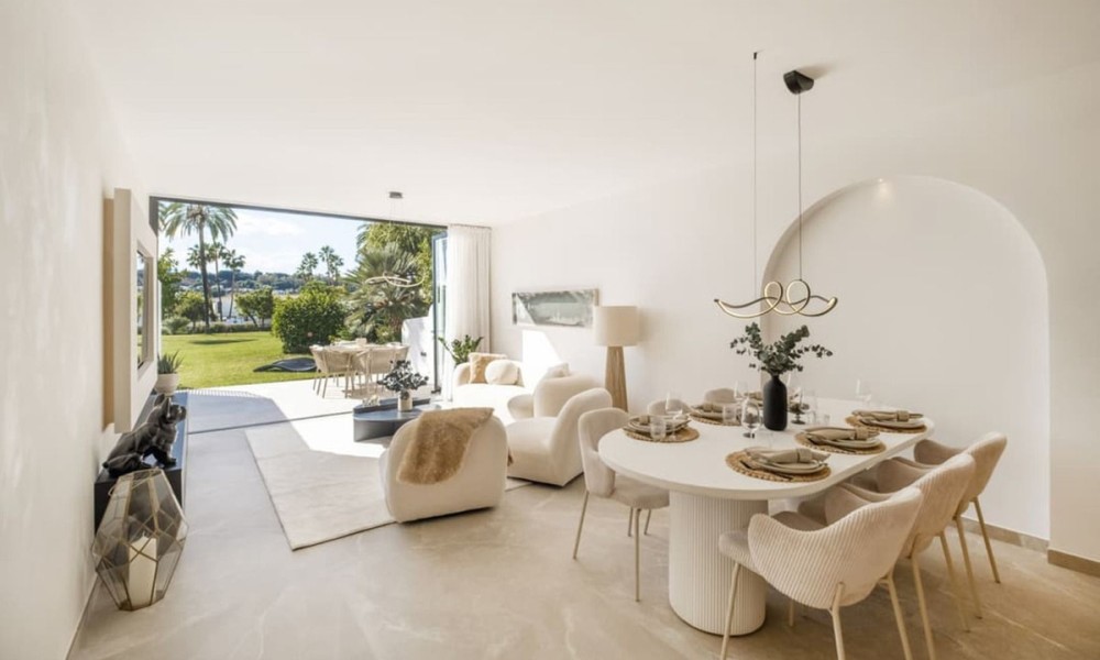 Fully Refurbished Townhouse | Aloha, Nueva AndalucíaSet within a charming Andalusian-style gated community in the heart of Nueva Andalucía’s Golf Valley, this beautifully refurbished townhouse combines contemporary design with timeless Mediterranean appeal. Soft neutral tones, clean architectural lines and high-quality finishes create a calm and elegant living environment throughout.Arranged over two levels, the home offers a bright and well-balanced layout. The garden level features a welcoming entrance patio, hallway and an open-plan living and dining area with a sleek, fully fitted designer kitchen. Large sliding doors open seamlessly onto the terrace and private garden, with direct access to the immaculately maintained communal gardens and swimming pool.Upstairs, the generous master suite enjoys an en-suite bathroom and a private terrace with views across the gardens, pool, Golf Valley and surrounding mountains.