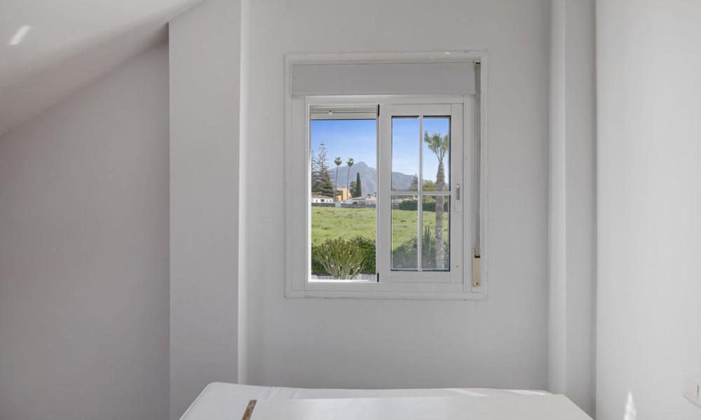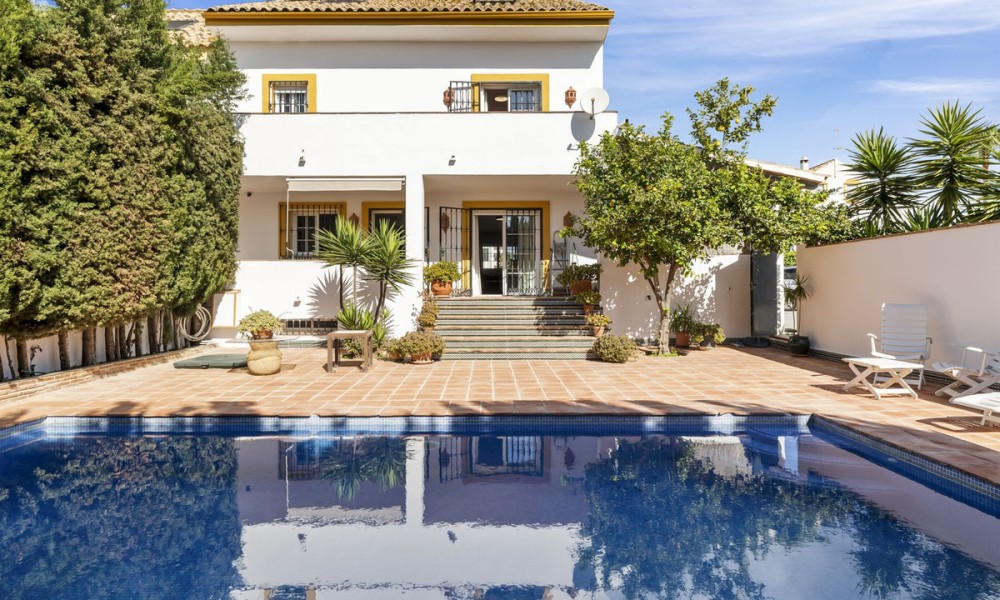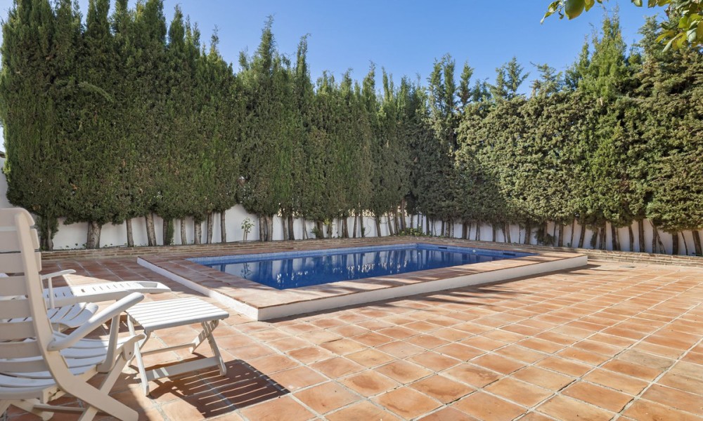 Set on a 240 m² plot, the home features a south-facing garden with mature landscaping, an inviting swimming pool, and sunny terraces totalling approximately 60 m². Whether hosting barbecues or enjoying quiet mornings, the outdoor areas are an extension of the home’s livable space.A welcoming entrance hall sets the tone for this warm family home. The basement level includes a private garage with space for two cars, along with a storage room and unused basement area offering potential for conversion to a gym, cinema room, or additional living space.Situated in a peaceful, low-density residential enclave, the property benefits from a community with low fees (€30/month) and an alarm system for added peace of mind. The home is a private haven within a friendly neighbourhood environment.Facing south, the property enjoys year-round sun exposure and delightful views of the countryside from the upper terrace, with glimpses of the sea in the distance. The pool area and garden are bathed in natural light throughout the day, enhancing the home’s indoor-outdoor appeal.Perfectly positioned within walking distance to the vibrant town centre of San Pedro de Alcántara, this home offers unparalleled convenience with shops, schools, cafés, and local amenities just minutes away. The beach is a short drive, while Marbella and Puerto Banús are easily accessible for upscale dining, shopping, and entertainment. Whether used as a permanent residence or a lock-and-leave holiday home, this property delivers a highly desirable lifestyle in one of the Costa del Sol’s most established neighbourhoods.