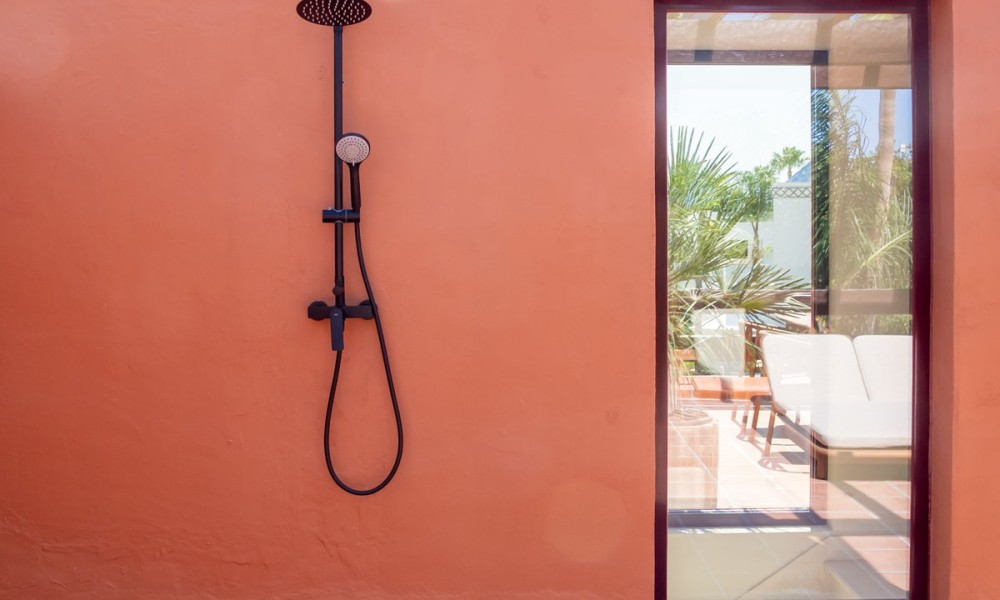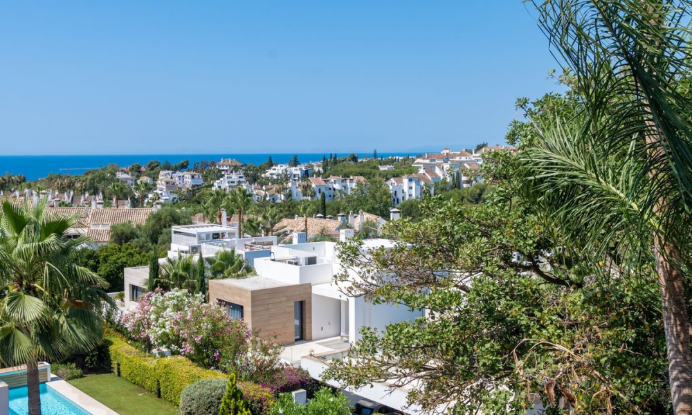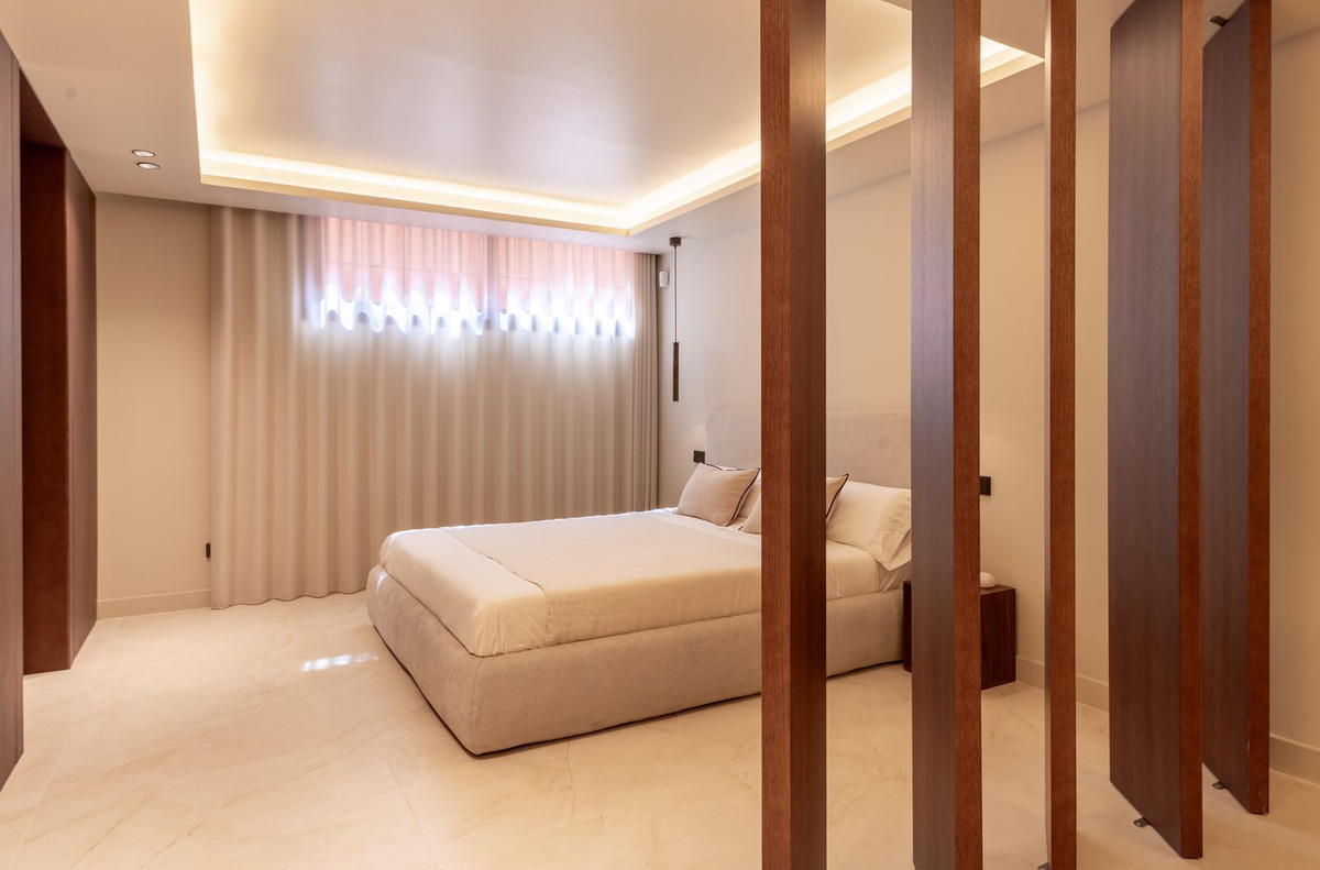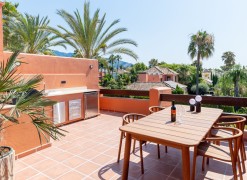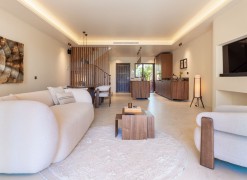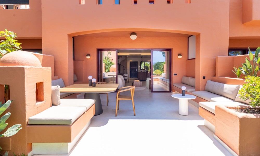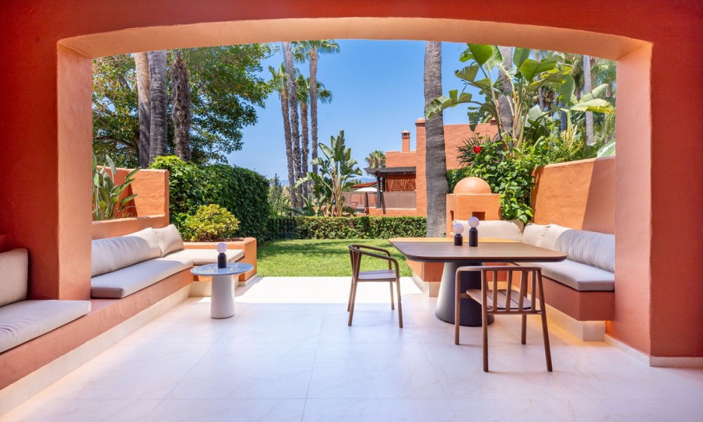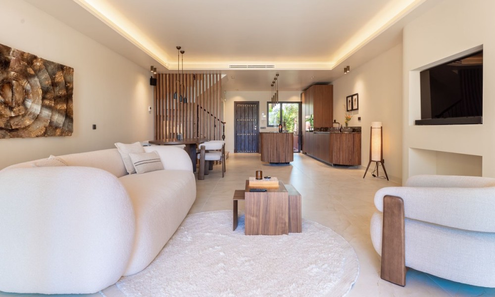 Situated in the exclusive Monte Marbella Club on Marbella’s Golden Mile, this fully renovated townhouse blends modern luxury with timeless design. Spanning 240 m² across three levels plus a rooftop solarium, it features an open-plan living area with a bio-ethanol fireplace, Siemens kitchen, private garden, and covered terrace. The upper floor hosts a principal suite with terrace and two guest bedrooms, while the basement offers a fourth en-suite bedroom and multipurpose space. Enjoy sea views from the rooftop with full outdoor kitchen. Located near Puente Romano, the beach, and Marbella’s top amenities, in a secure gated community with communal pool.Set within the prestigious Monte Marbella Club in Altos de Puente Romano, this exquisitely renovated townhouse offers a rare blend of luxury, security, and location on Marbella’s iconic Golden Mile. The property, designed by BOHER and completed in 2025, reflects a refined contemporary style with top-tier finishes and premium brand fittings throughout.The home spans three levels plus a solarium, with a total built area of 240 m². The main floor boasts a sunlit open-plan layout combining a stylish lounge with bio-ethanol fireplace, a dining area, and a sleek kitchen featuring warm wooden cabinetry and Siemens appliances.