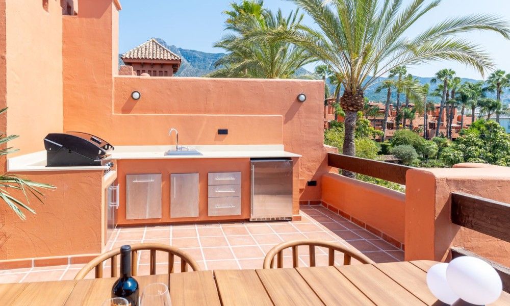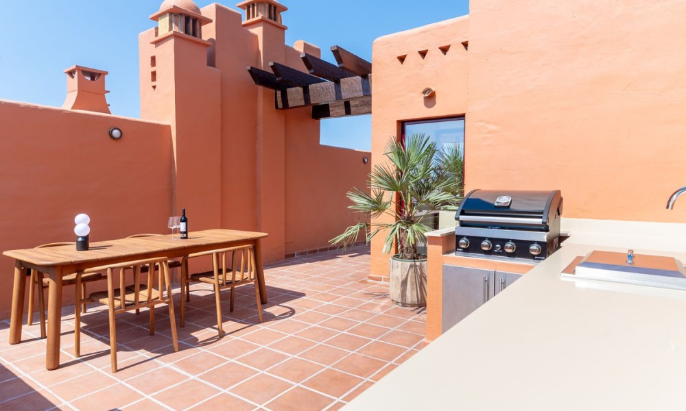 Large sliding doors lead to a covered terrace and private garden, offering seamless indoor-outdoor living.Upstairs, the main sleeping quarters include a spacious principal suite with custom wardrobes and a private terrace, accompanied by two additional bedrooms sharing a well-appointed bathroom. The lower level hosts a fourth en-suite bedroom and a flexible multipurpose room ideal for a home cinema, gym, or games area.Entertainment continues on the rooftop solarium, where a full outdoor kitchen and lounge area capture sea views and La Concha mountain backdrop, perfect for sunset gatherings.The gated community ensures year-round peace of mind, with a communal pool and manicured surroundings. A private garage space and southwest orientation enhance the property’s comfort and functionality.Located less than a 20-minute walk from the renowned Puente Romano Resort, Marbella’s promenade, and beaches, the townhouse offers immediate access to the area’s finest dining, beach clubs, and designer boutiques. Just minutes from Puerto Banús and Marbella town centre, the property represents a secure investment for those seeking elegance, lifestyle, and prime positioning in one of Spain’s most sought-after coastal addresses.