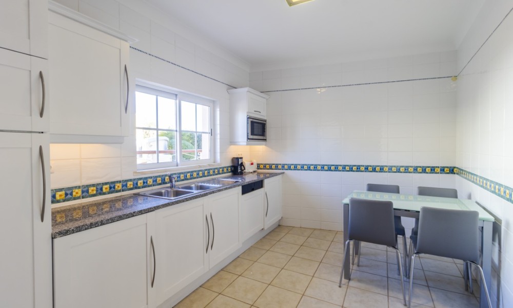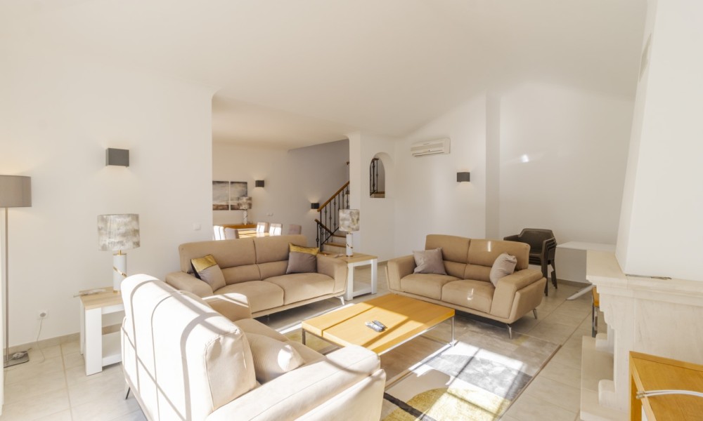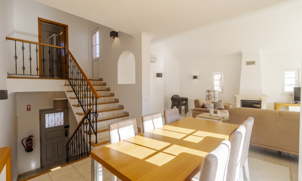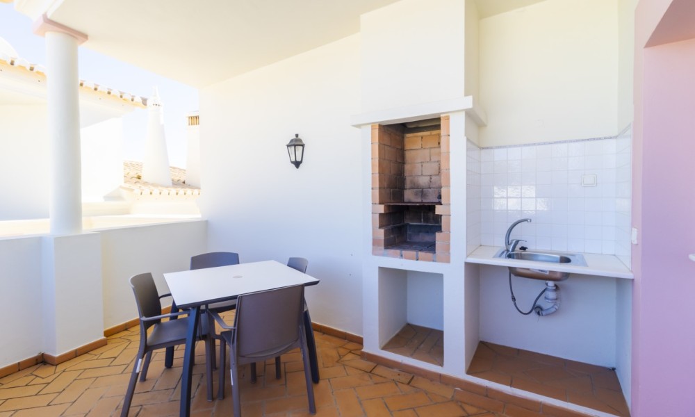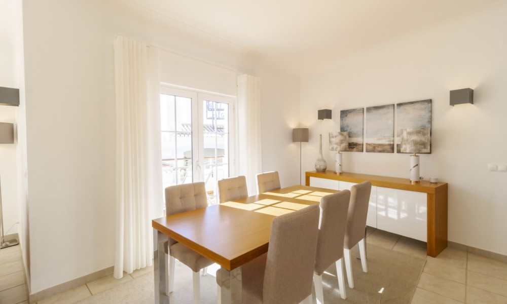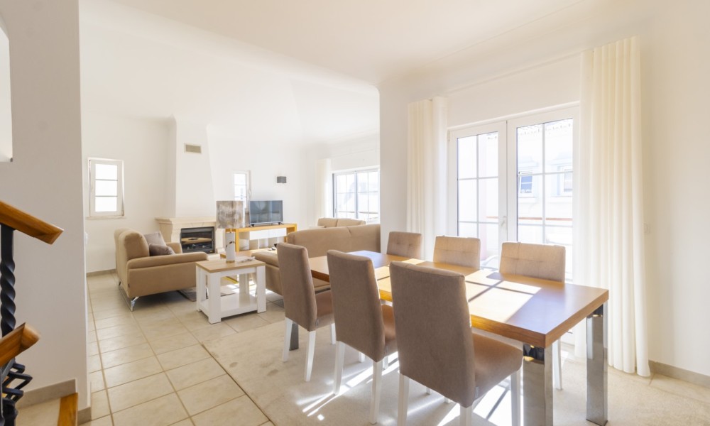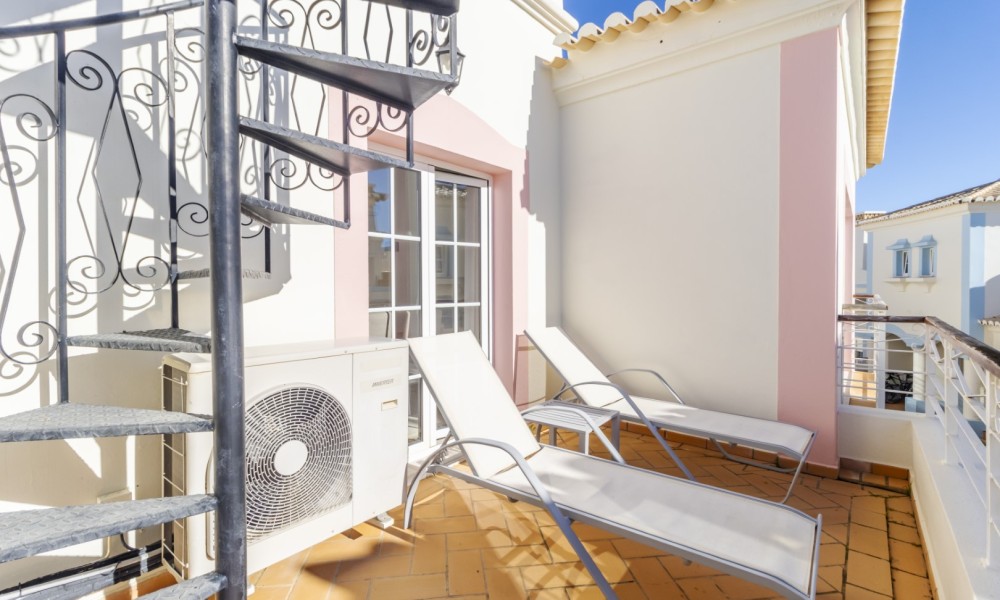 This beautiful 2 bedroom townhouse is located in Quinta da Encosta Velha, conveniently close to all amenities of Budens, and just a 5 minute drive to the beautiful Salema beach.The living space is spread across two levels. The upper level features a bright spacious lounge and dining area with patio doors opening onto a balcony. The property also offers a roof terrace with 2 sun loungers to appreciate the fantastic views of the countryside and the golf course.Adjacent to the entry hallway, you’ll find a fully equipped kitchen with integrated appliances. From the lounge, a staircase leads up to a terrace with a barbecue and outdoor dining area, along with one of the bathrooms.The lower level comprises a double and a twin bedroom and another main bathroom.