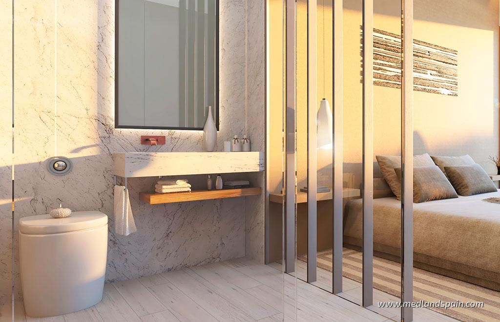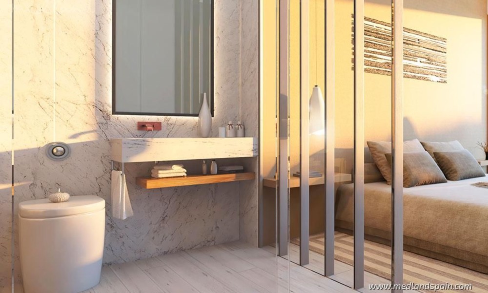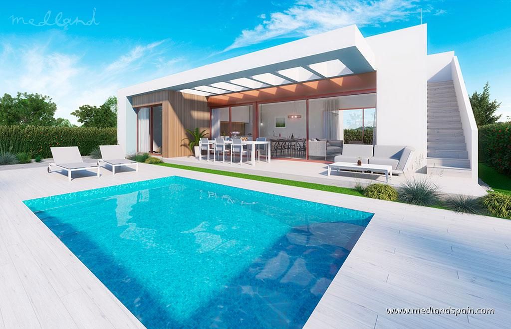 New promotion of detached villas in Vistabella Golf, a residential resort built around a golf course of the same name, in Orihuela Costa. There is a commercial area with a supermarket and other leisure facilities available within the resort. The closest town is Los Montesinos, with a complete selection of services available all year ‘round. The beaches of Orihuela Costa and Torrevieja are only 15 minutes away by car.Modern villas, built on plots between 304m2-371m2, available in three models: villas on one level with 3 bedrooms and a private solarium; or two-storey villas with 3 or 4 bedrooms with a large sun terrace.