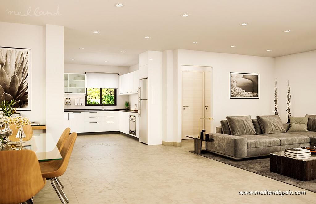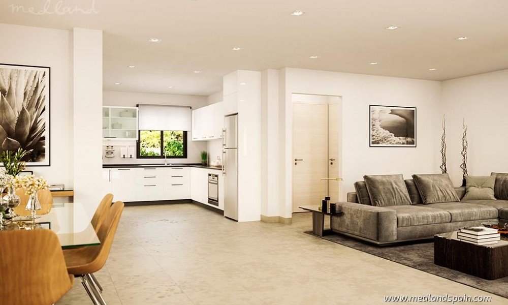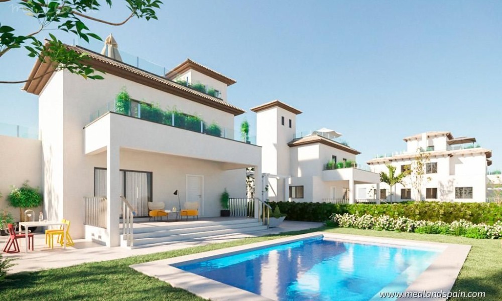 Modern project, only 600m from the beach in La Marina, located in the northern part of Costa Blanca South. All the daily necessities can be found in the main commercial area, which is close by. The area is ideally located between Santa Pola and Guardamar and is only 20 minutes away by car from the Alicante airport.The project offers villas with a traditional external Mediterranean design, but with a contemporary internal design. There are two available models: quad-villas with 2 bedrooms and 2 bathrooms and detached villas with 3 bedrooms and 2 bathrooms. Both villas are distributed over two floors and consist of a spacious open-plan lounge, dining area and kitchen, which opens onto a large terrace, as well as 2 bedrooms and 1 bathroom on the first floor, with a private terrace off the master bedroom.