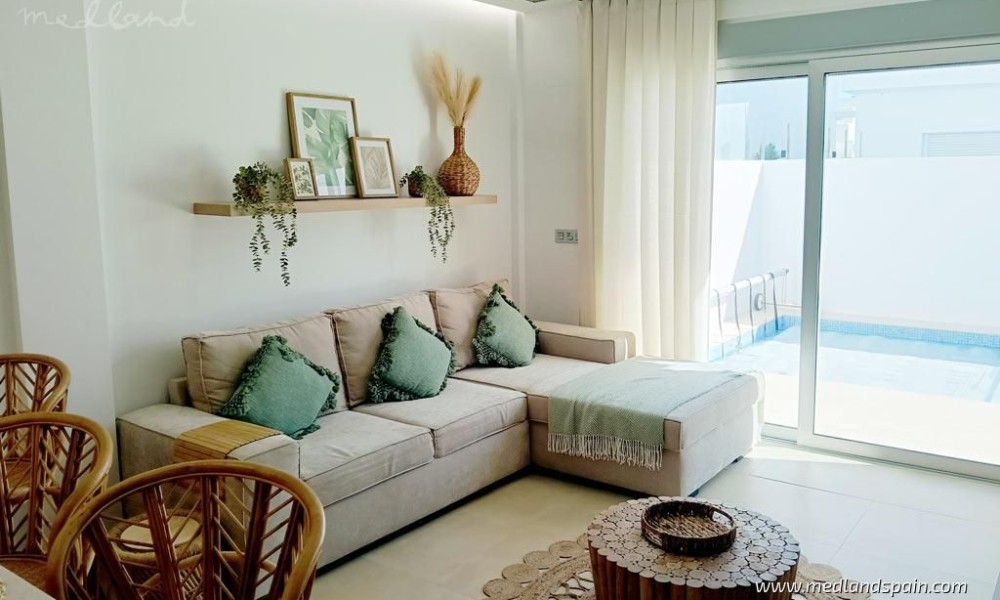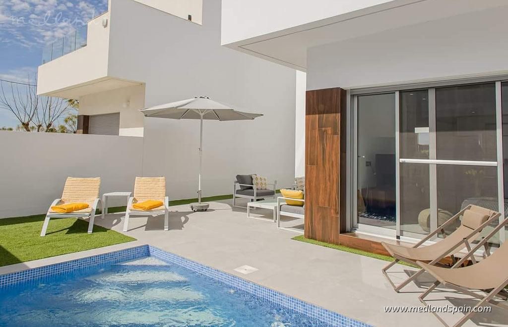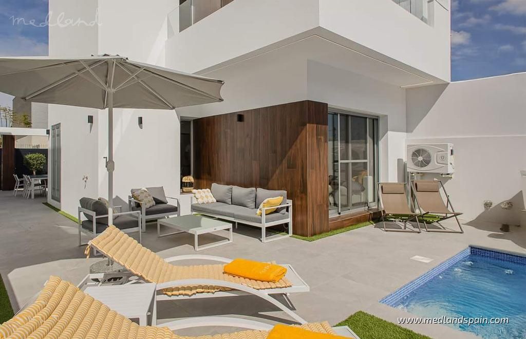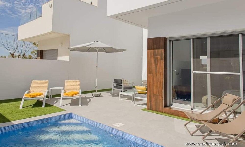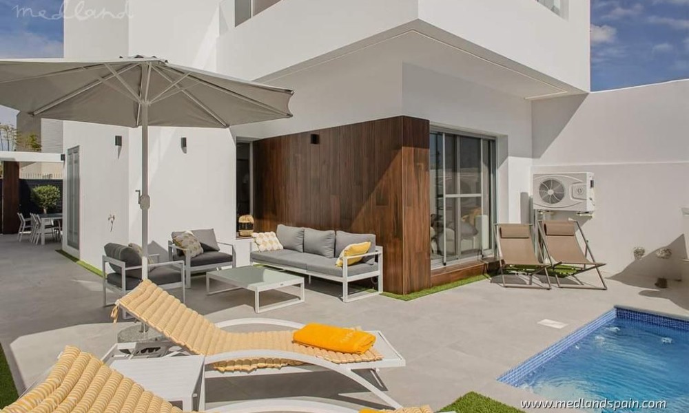Modern villas with a private pool in San Fulgencio, on the Costa Blanca South. The town is less than 15 minutes away from the beaches of Guardamar, and is an ideal place for those who appreciate a peaceful environment, surrounded by cultivated fields, without giving up on all the services of a big city. There is range of services available in San Fulgencio, like schools, supermarkets, pharmacies, a large residential area called “La Marina”, as well as an excellent selection of leisure activities. The cities of Santa Pola, Guardamar and Torrevieja are between 15 and 25 minutes by car, while Alicante International Airport is only 35 minutes away.