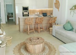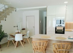 Two storey villas with 3 bedrooms and 2 bathrooms. The main floor presents an open concept design, combining the kitchen, dining area and lounge in a single space that extends through the large windows to the terrace and private pool. The en-suite master bedroom, and a guest toilet, are on this floor too. The 2 remaining bedrooms are on the first floor, both with private terraces, and a shared bathroom. All villas include kitchens equipped with white goods, pre-installation for ducted A/C, a private pool, and paved parking on the premises.