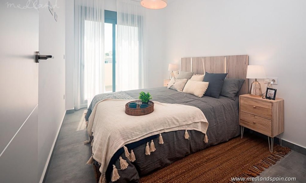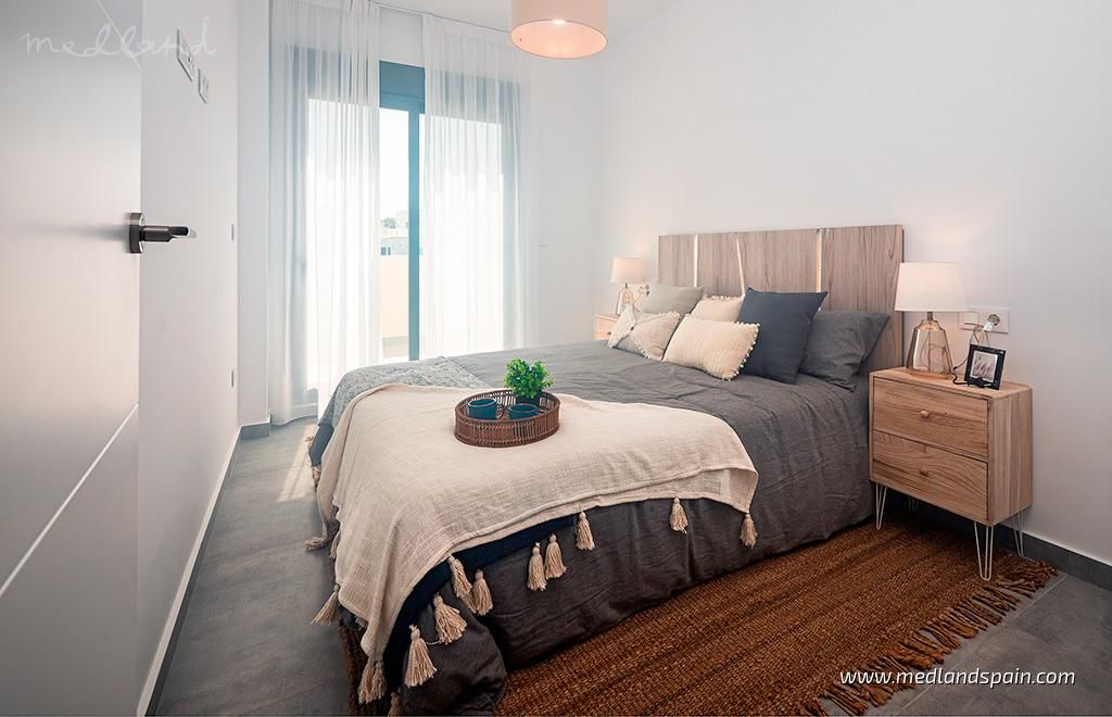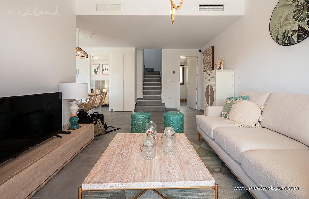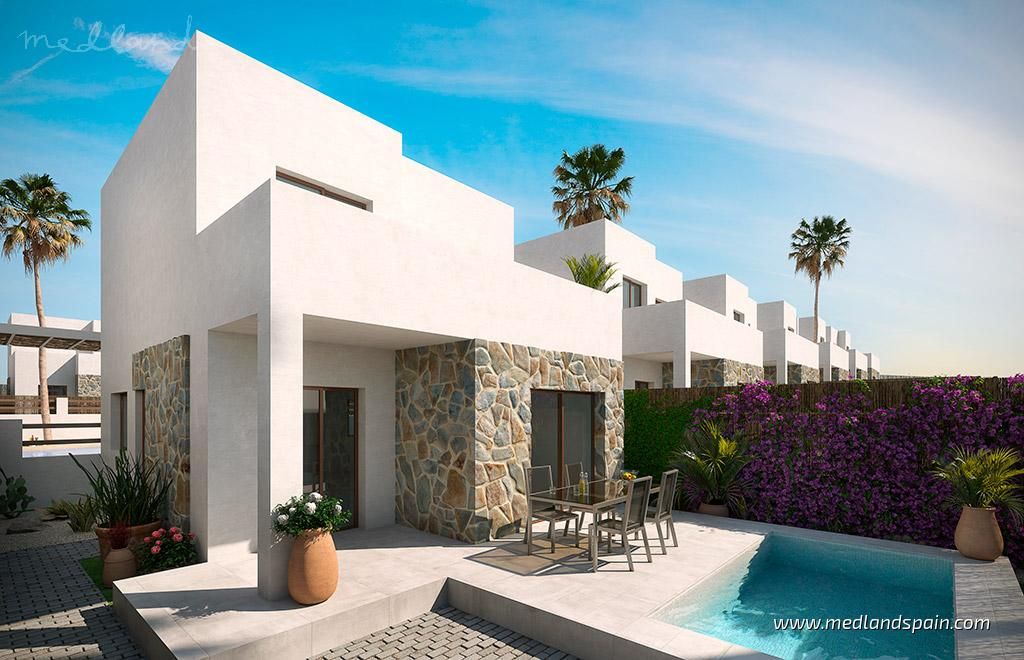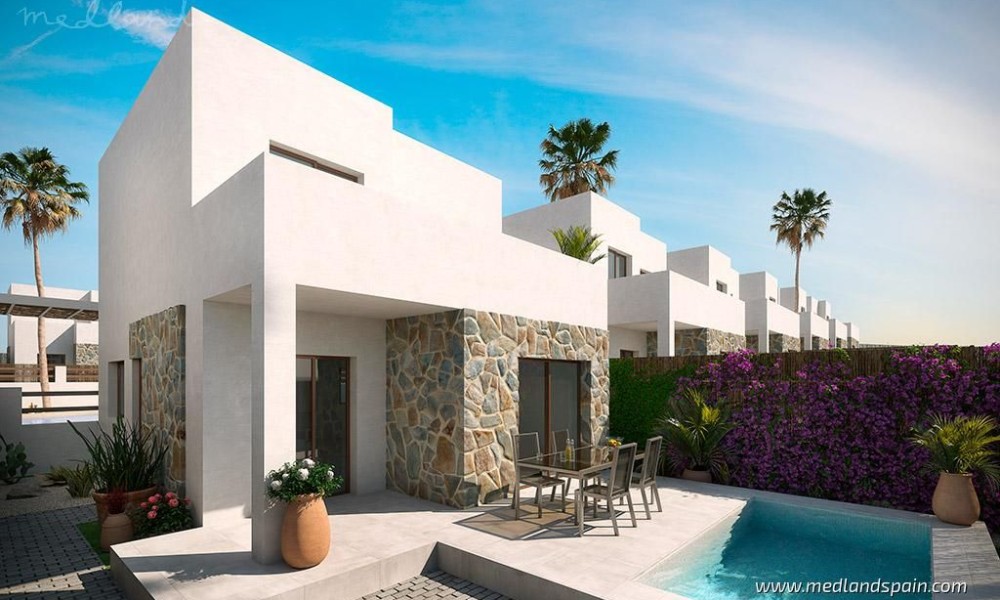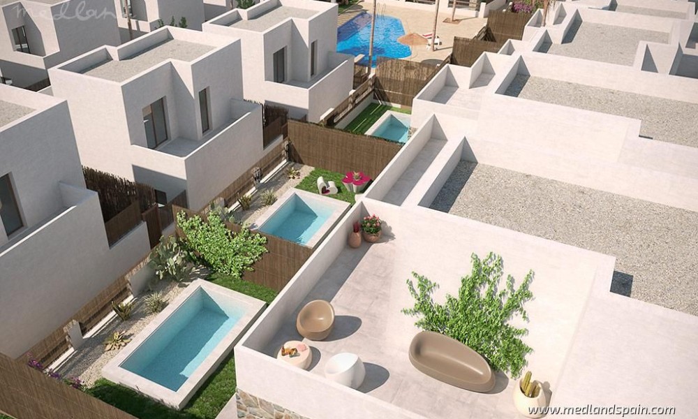 All properties present a spacious and bright open plan lounge, dining area and kitchen, with direct access to a South-facing terrace and garden with private pool. Depending on the model, some properties include a parking space on the premises.The villas have been designed with neutral and warm materials, as well as natural stone on the facades, and it is possible to personalise the interior finishes. The villas include pre-installed A/C, fitted wardrobes, fully installed alarm system, basic Smart Home system, and a landscaped garden with a private pool.Considering the location, the design, and the price, these villas offer excellent value for money.