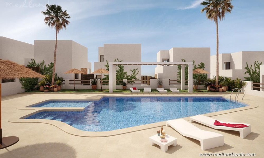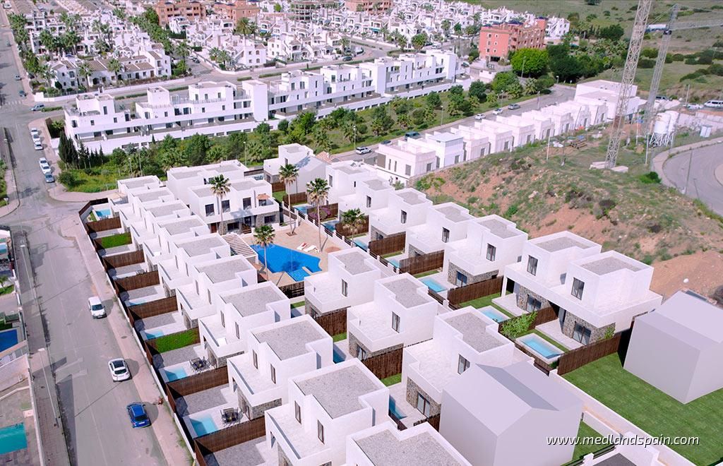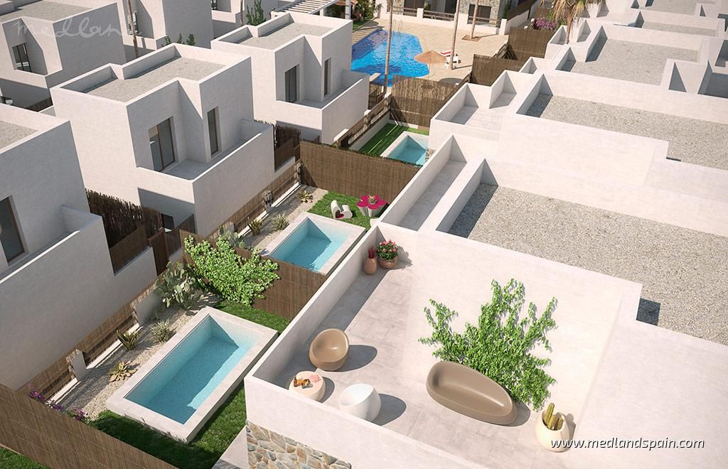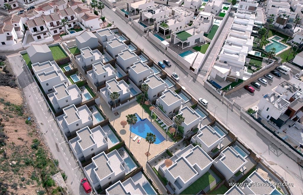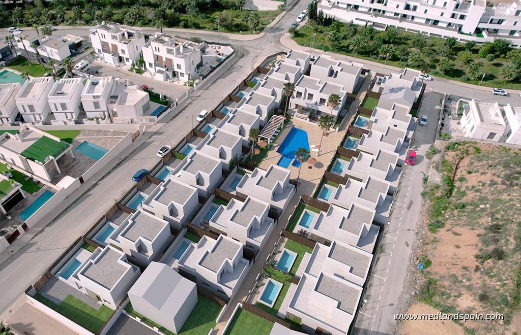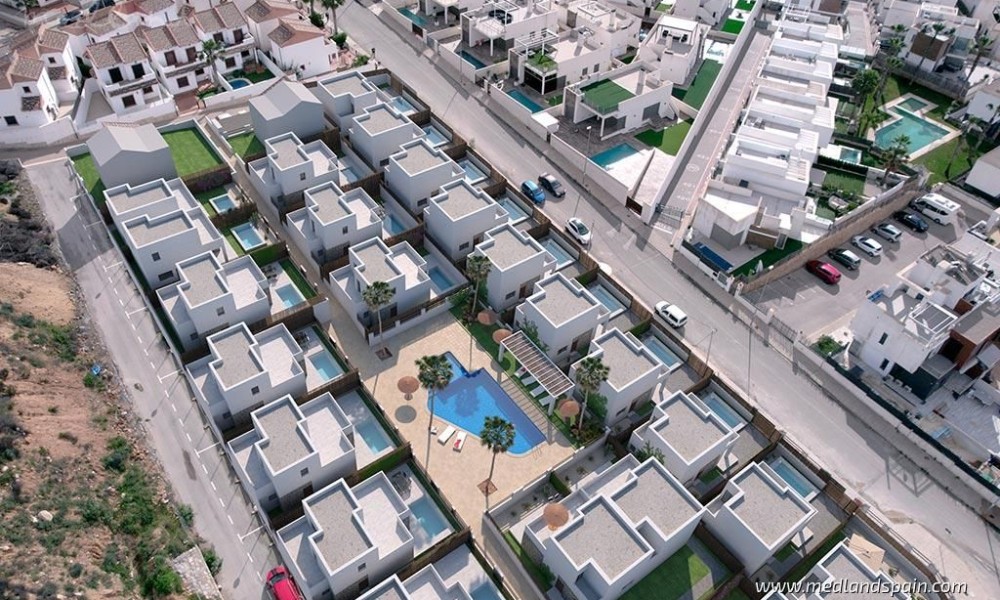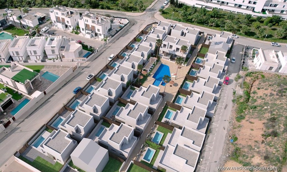 Residential complex in the popular Villamartín area on the Costa Blanca South. Very close to the Villamartín Golf Course, as well as the Villamartín Plaza, with a selection of bars and restaurants. The impressive La Zenia Boulevard shopping centre is a short drive from the complex, while the magnificent beaches of Playa Flamenca and La Zenia are only 15 minutes away by car.The complex has been designed with a Mediterranean feel and includes a communal area with a large pool and relax area, for all residents to enjoy. The project comprises detached villas on two floors, with 3 bedrooms and 2 bathrooms, with a choice of 1 or 2 bedrooms on the ground floor; and semi-detached villas on two floors, with 2 bedrooms and 2 bathrooms.