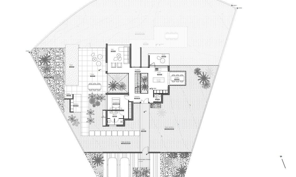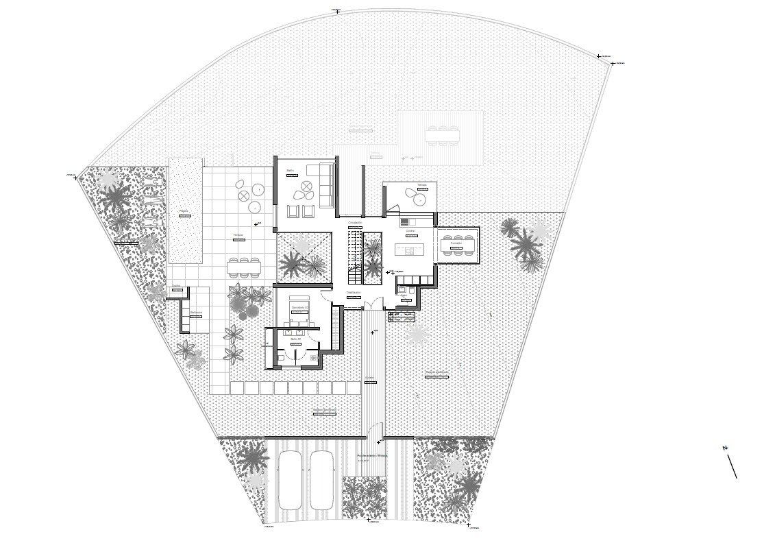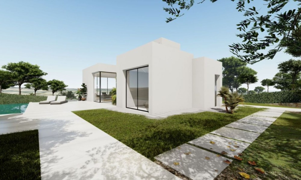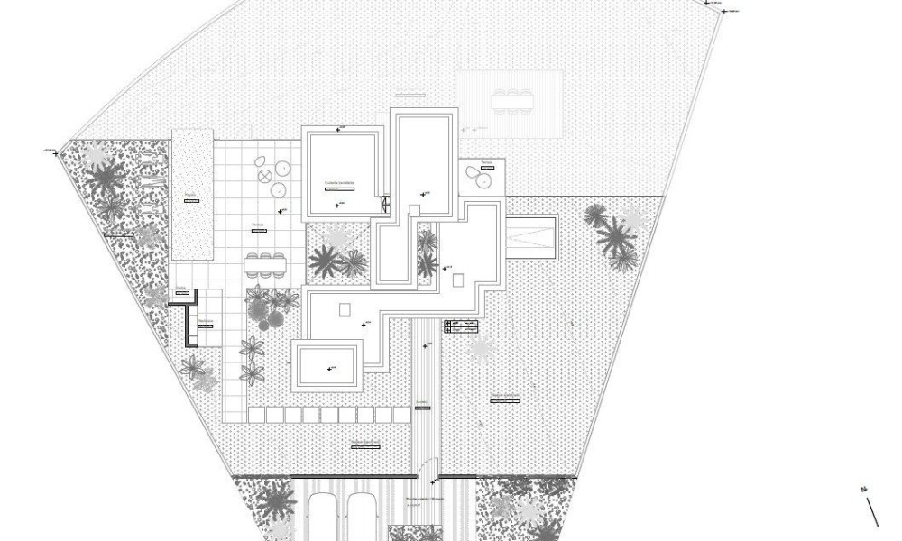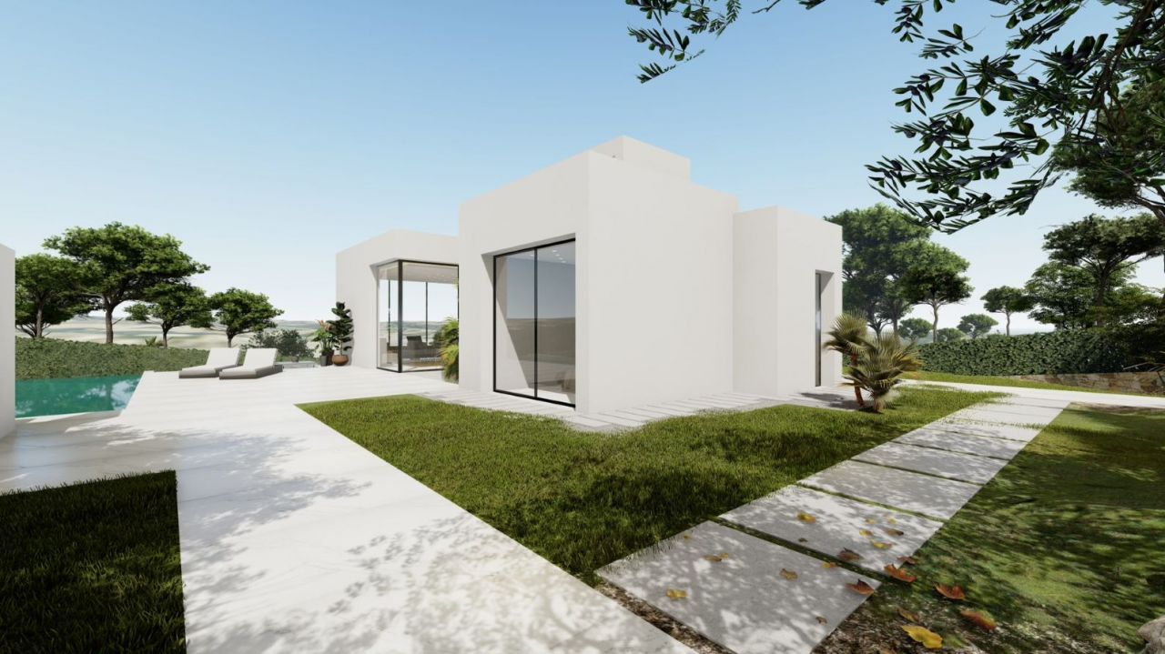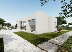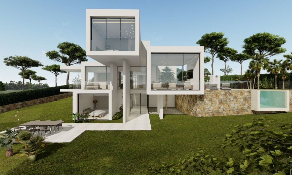 ~ Outside we find terraces, green areas, swimming pool and native plants/trees.~ On the first floor we have a double bedroom and a bathroom, as well as access to the terrace.~ The semi-basement features a large bedroom and a bathroom, access to a patio, and a laundry room.~ For this exceptional villa, they only use the best quality materials and high-end finishes. During the construction they have into account the durability and green factor, thinking about the future and the environment.~ And let’s not forget the spectacular views of the golf course.~