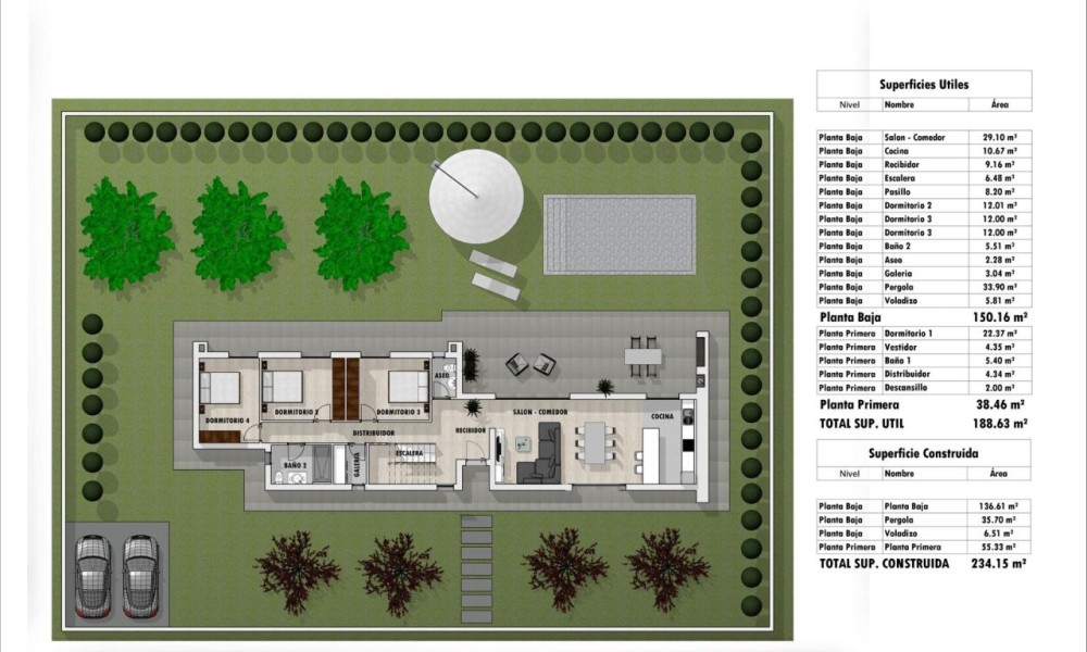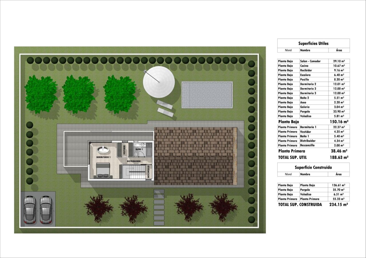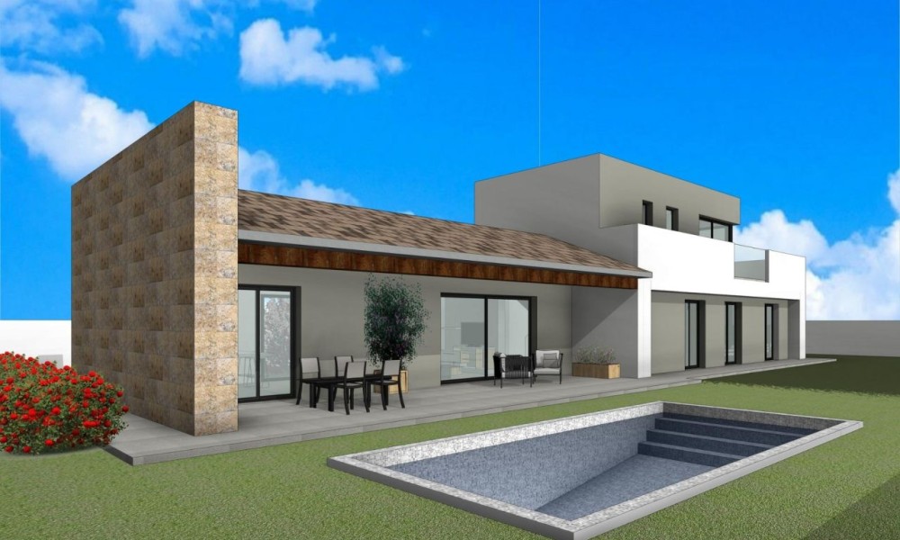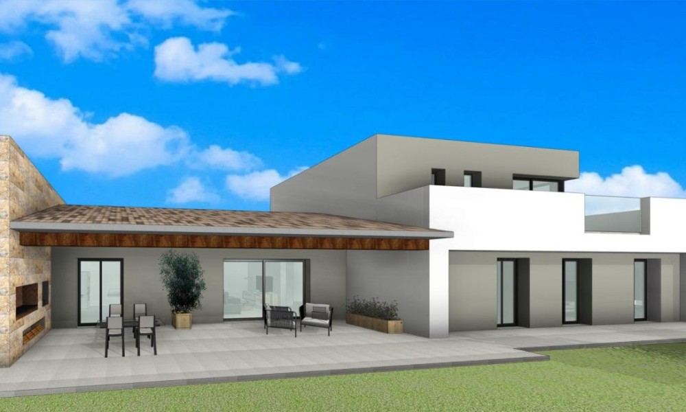 NEW BUILD VILLAS IN PINOSO Luxury new build villas in Pinoso (Alicante) with different layouts on 1 or 2 floors and 3 or 4 bedrooms, where you can enjoy idyllic views of the mountains, enjoy the sun and the tranquillity of the area. The villas will be built on rustic plots of 10.959 m2, of which about 2.000 m2 will be fenced, with all its water supplies, electricity, installation of a set of photovoltaic panels for self-consumption of electricity and waste water purification system by means of biological oxidation treatment plant. It will have top quality finishes and a very extensive luxury quality specifications. Equipped with 8x4m swimming pool with saline chlorinator, tiled pool perimeter, landscaped area with gravel, automatic motorised access gate to the plot (motor included). The homes will have pre-installation of air conditioning with hot and cold machine included, water aerothermal system, night areas with motorised blinds, built-in wardrobes finished and lacquered in white, porcelain tiling, pre-installation of fireplace in the living room, bathrooms fully finished with all their components and accessories of the highest quality and armoured door. Emphasize the quality of construction of the house for its insulation with thermo-clay bricks, plasterboard with rock wool, single-layer facade, windows with thermal bridge, aluminium shutters and Glass-Sun glass.