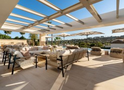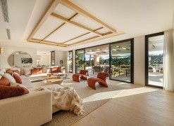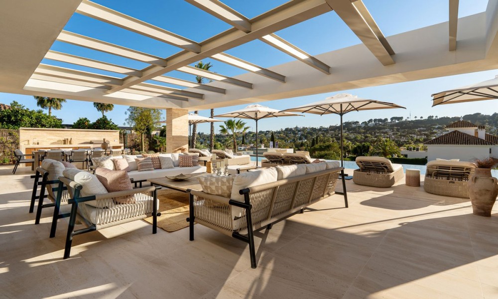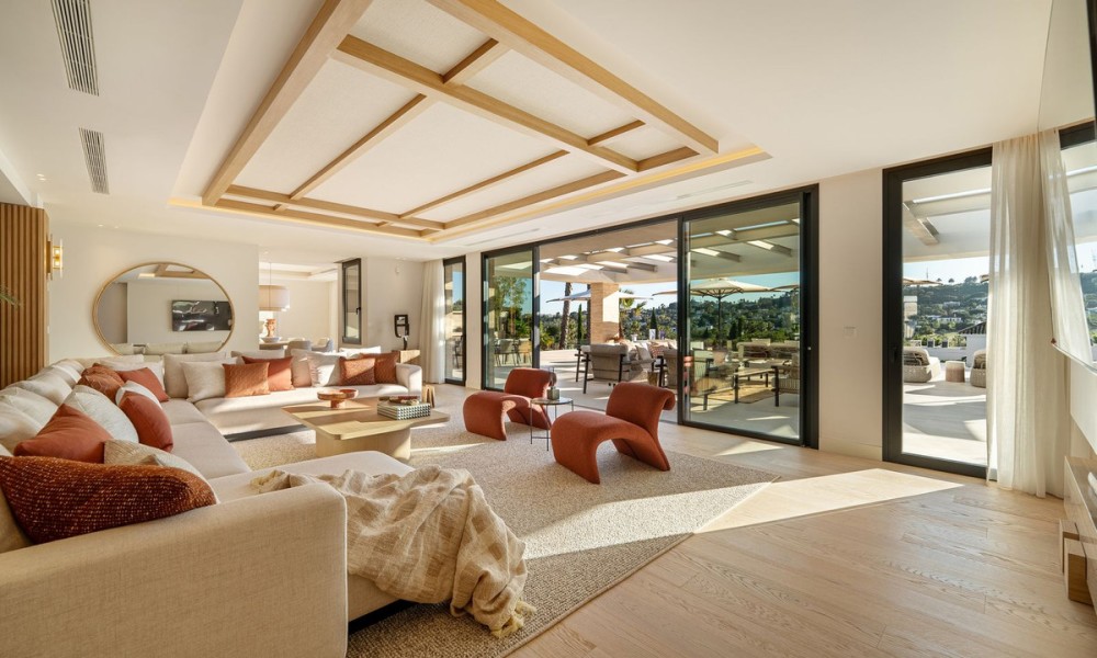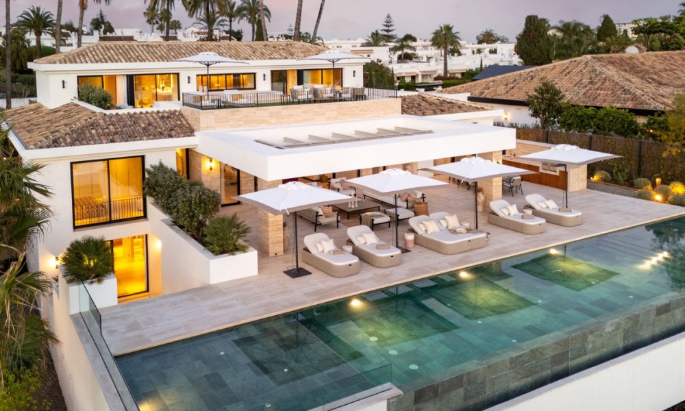 Located in the exclusive residential enclave of Aloha in Nueva Andalucía, this fully renovated villa showcases a stunning architectural blend of tradition and contemporary sophistication. Designed by GC Studio and constructed by B. Solis, the property features a symmetrical façade, natural materials, ribbed wooden accents, and striking clean lines. Traditional roof tiles and a landscaped entrance by Juan Pedro Sacedón Paisajismo bring a strong sense of local heritage and harmony with nature.With 840 m² of built space across generous interiors, the villa is designed for both entertaining and relaxed family living. The open-plan living and dining area flows seamlessly with calming neutral tones and natural finishes, all enriched by warm wood elements that divide spaces with subtle elegance.The villa includes six spacious bedrooms and six bathrooms, all finished to luxurious standards. Each bedroom is positioned to ensure maximum privacy and comfort, with elegant materials and thoughtfully curated lighting.Two guest toilets are included, offering additional convenience for visitors, and the spacious layout could easily accommodate staff quarters if needed.Perfect for entertaining, the villa’s expansive indoor-outdoor flow connects living spaces with lush gardens and terraces. The west-facing orientation ensures long hours of afternoon light and dramatic sunset views over the nearby golf courses.
