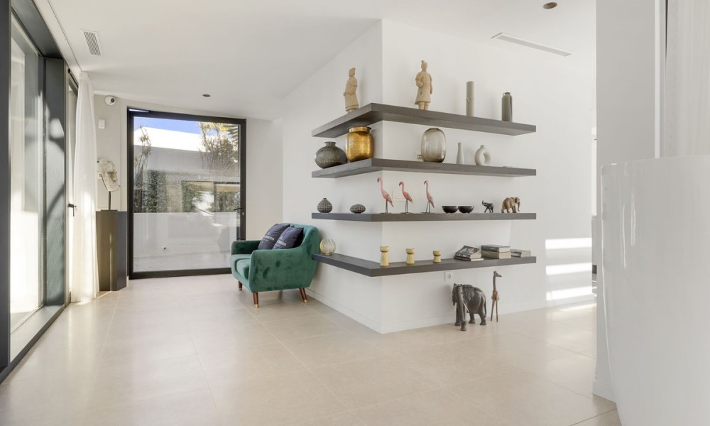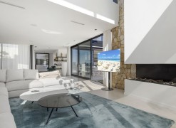 The main floor features a double-height entrance hall leading into a spacious living room with fireplace, a stylish dining area with its own fireplace, and an open plan kitchen fitted with Blum cabinetry and appliances by Miele and Bora. This level also includes two guest bedrooms, a guest toilet and a laundry area, all opening onto expansive terraces, landscaped gardens and a 56 m² private pool.