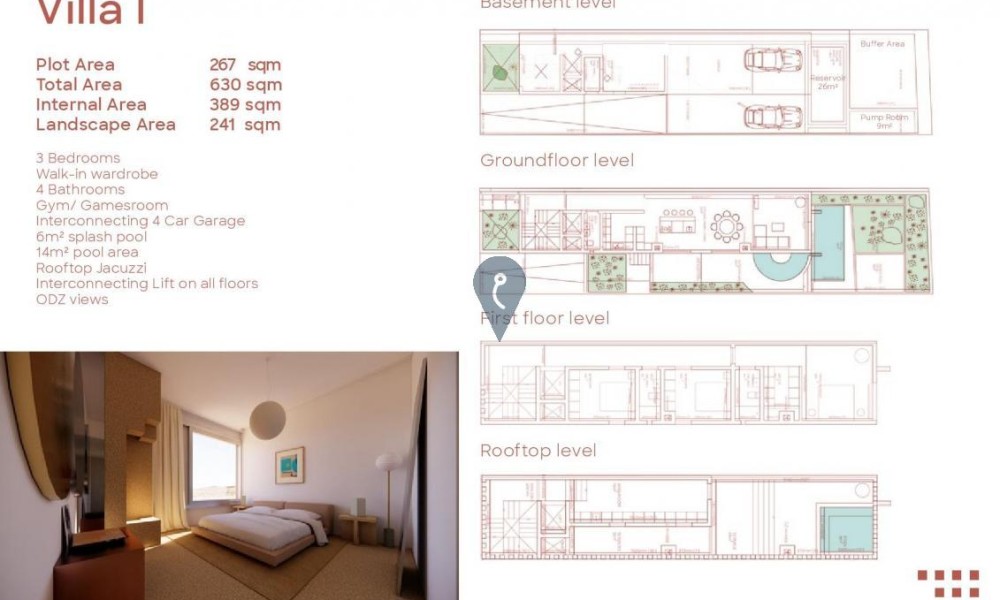 Additional amenities include a four-car garage, a private lift connecting all floors, a fully equipped gym, and a games room.